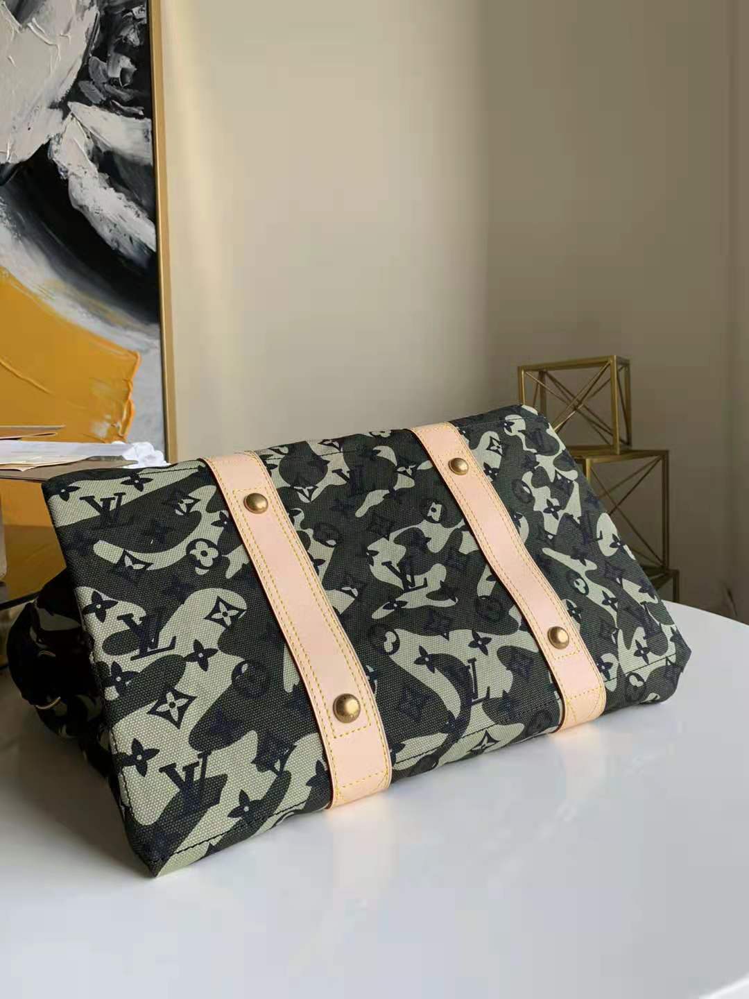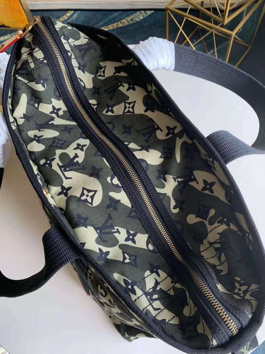 M95783迷彩绿 尺寸:38x30x19陈冠希同款 ,迷彩包包,专有进口面料,设计将迷彩图案和传统花押字融为一体,布面迷彩男士购物袋oo[握手][握手]实物拍摄 ,自家潮品 是众多明星的追捧 男女通用