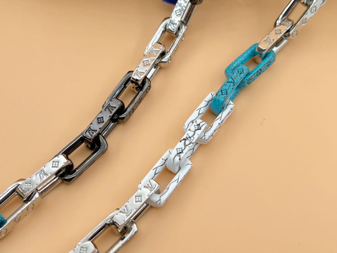 LV竹节项链 拼接古巴链条 本款 Monogram Chain 项链展现繁复设计和工业美学的融合。粗犷精钢链环渲染摩登色彩,交替呈现雾面和沙砾纹理。每只链环的 Monogram 铭纹再添经典元素。