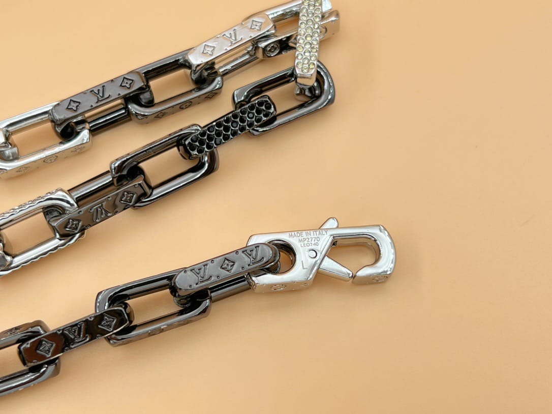 LV镶钻竹节项链 本款 Monogram Chain 项链以色彩迥异的人造水晶点亮经典设计,为粗犷精钢链环镂刻标志性 Monogram 图案,与当季成衣系列相得益彰。
