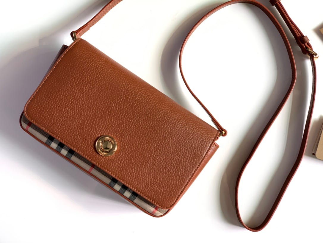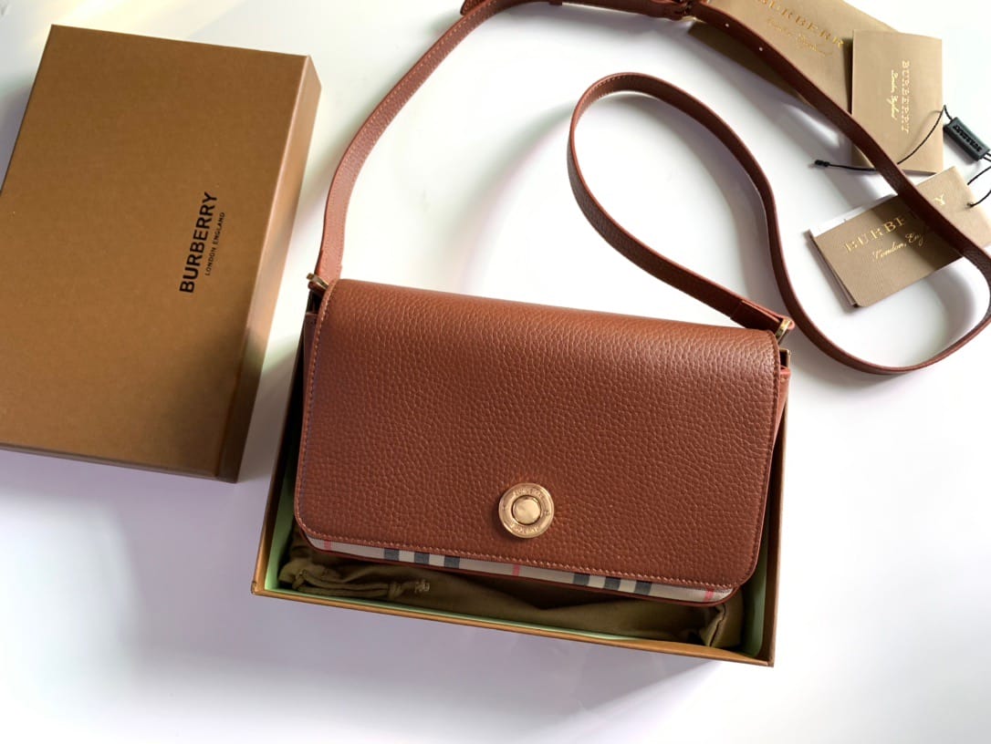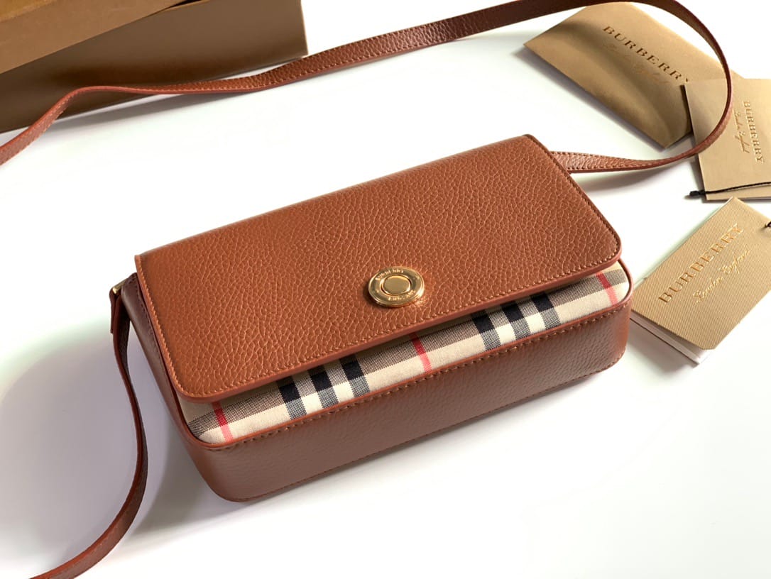 【Burberry?柏宝利】? Vintage 格纹拼皮革小号斜背包 精巧的斜背包,选用意大利鞣制粒纹皮革与典藏 Vintage 复古格纹裁片打造。可单肩背、斜背,或缔造手拿包造型。?专柜品质!做工精细?实物拍摄?,??80251611棕色,尺寸: 21 x 12.5 x 4.5cm