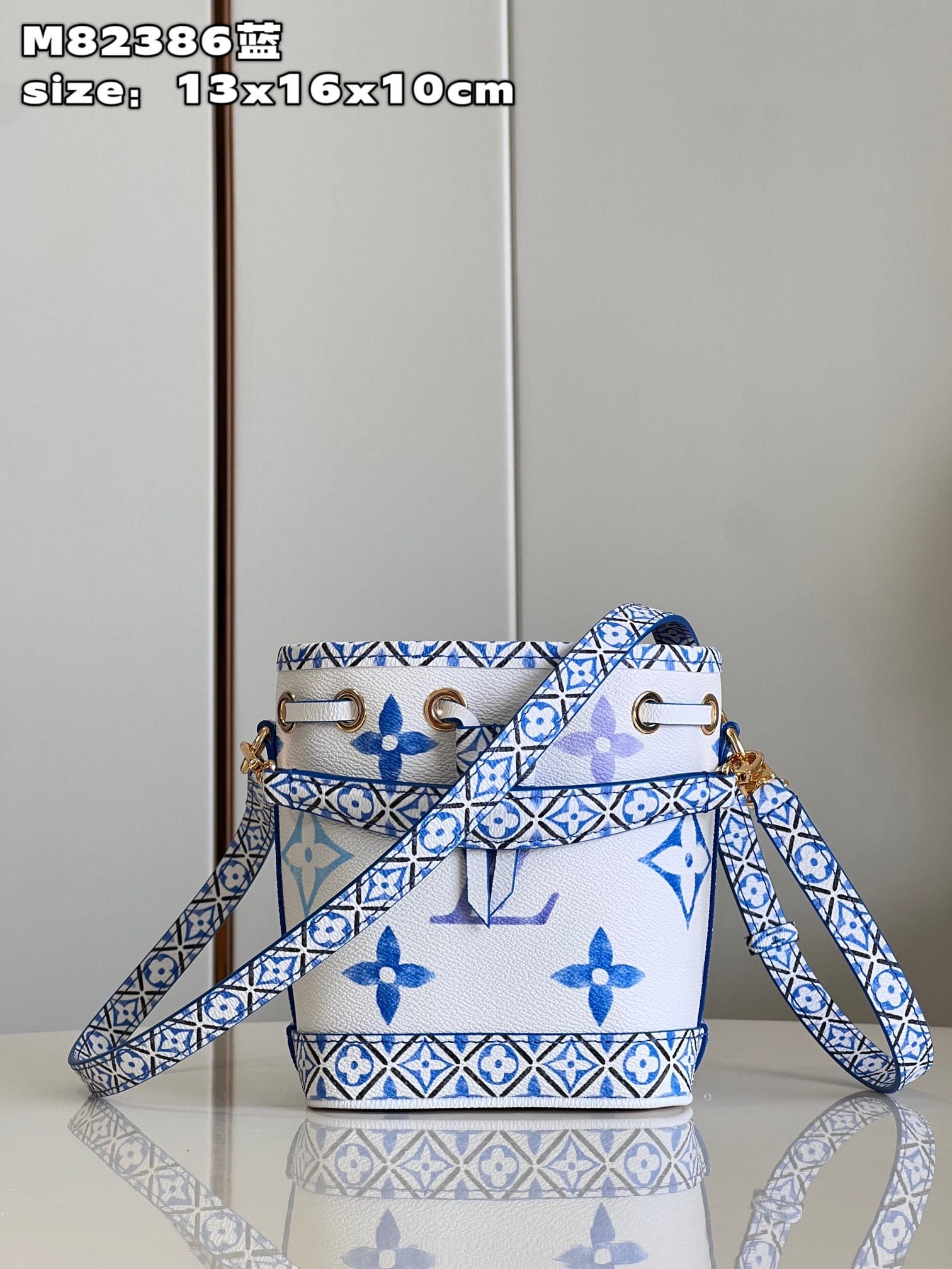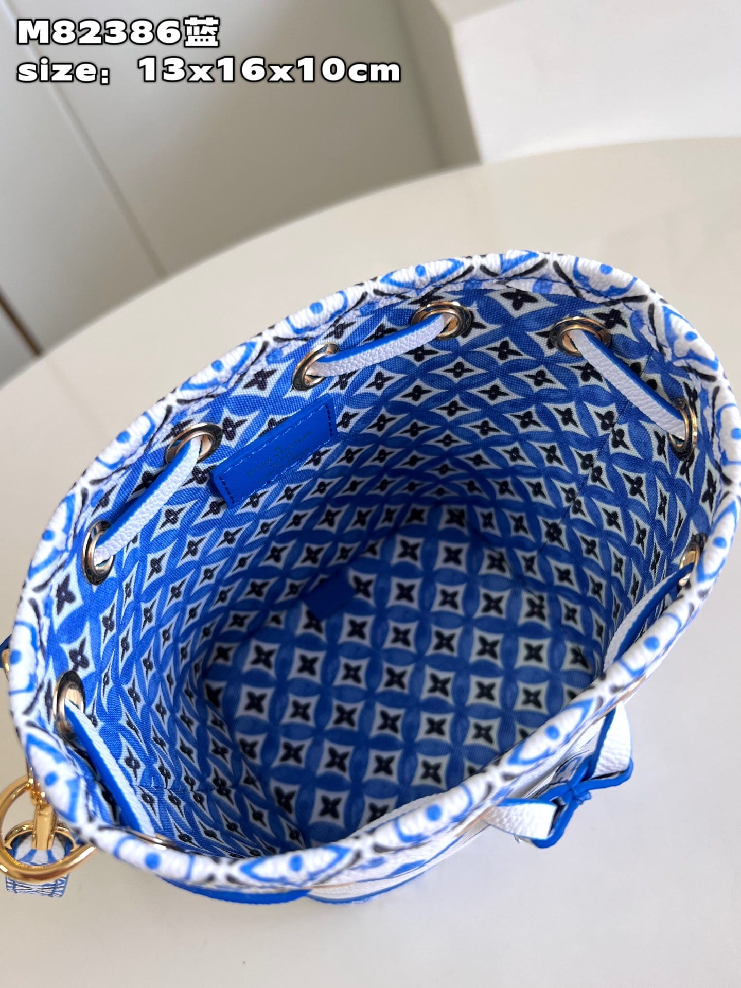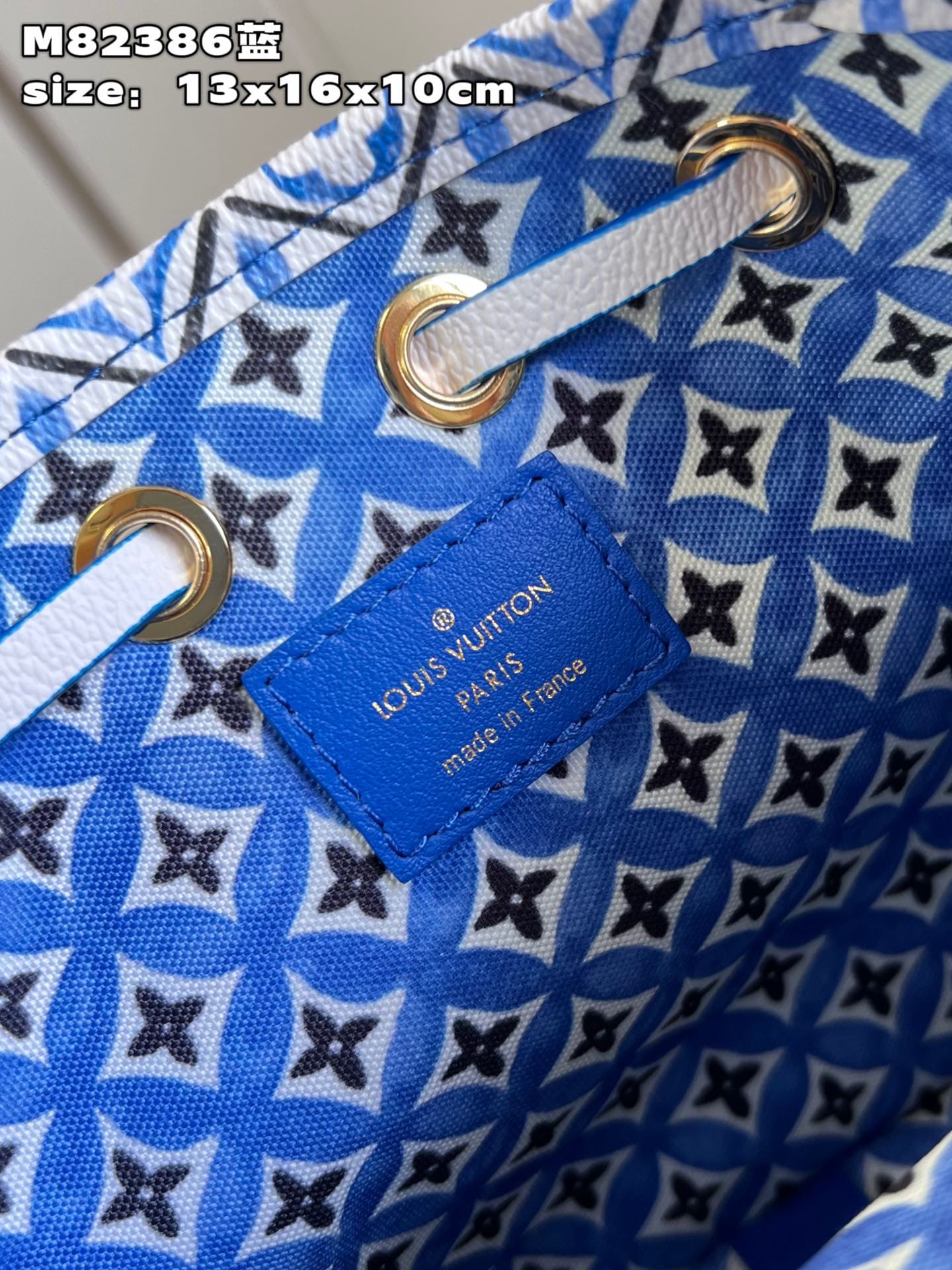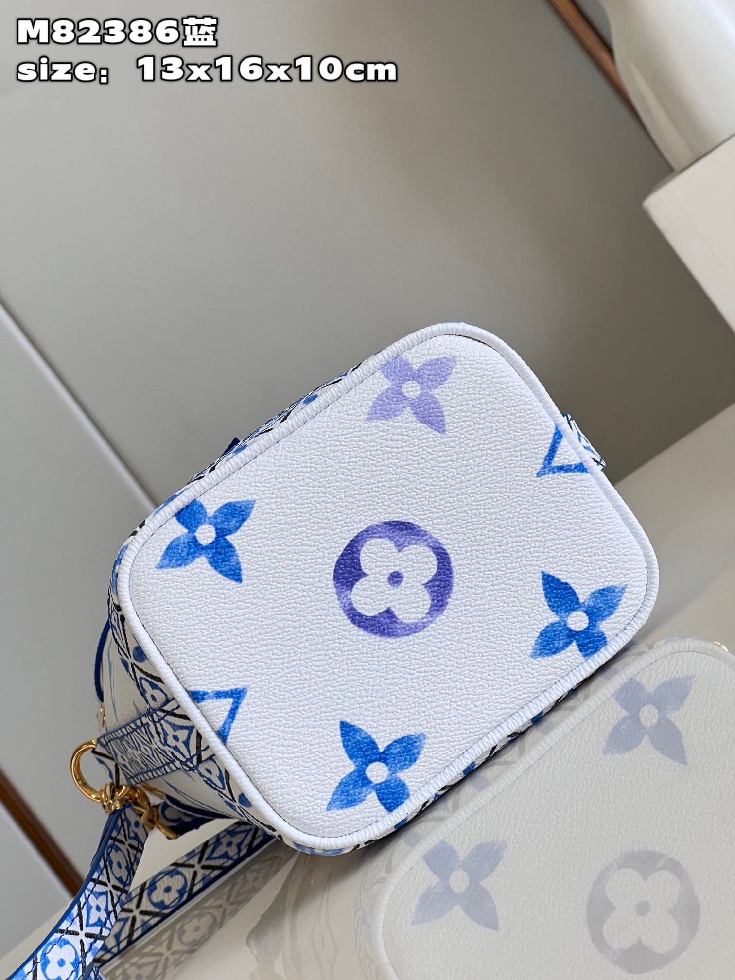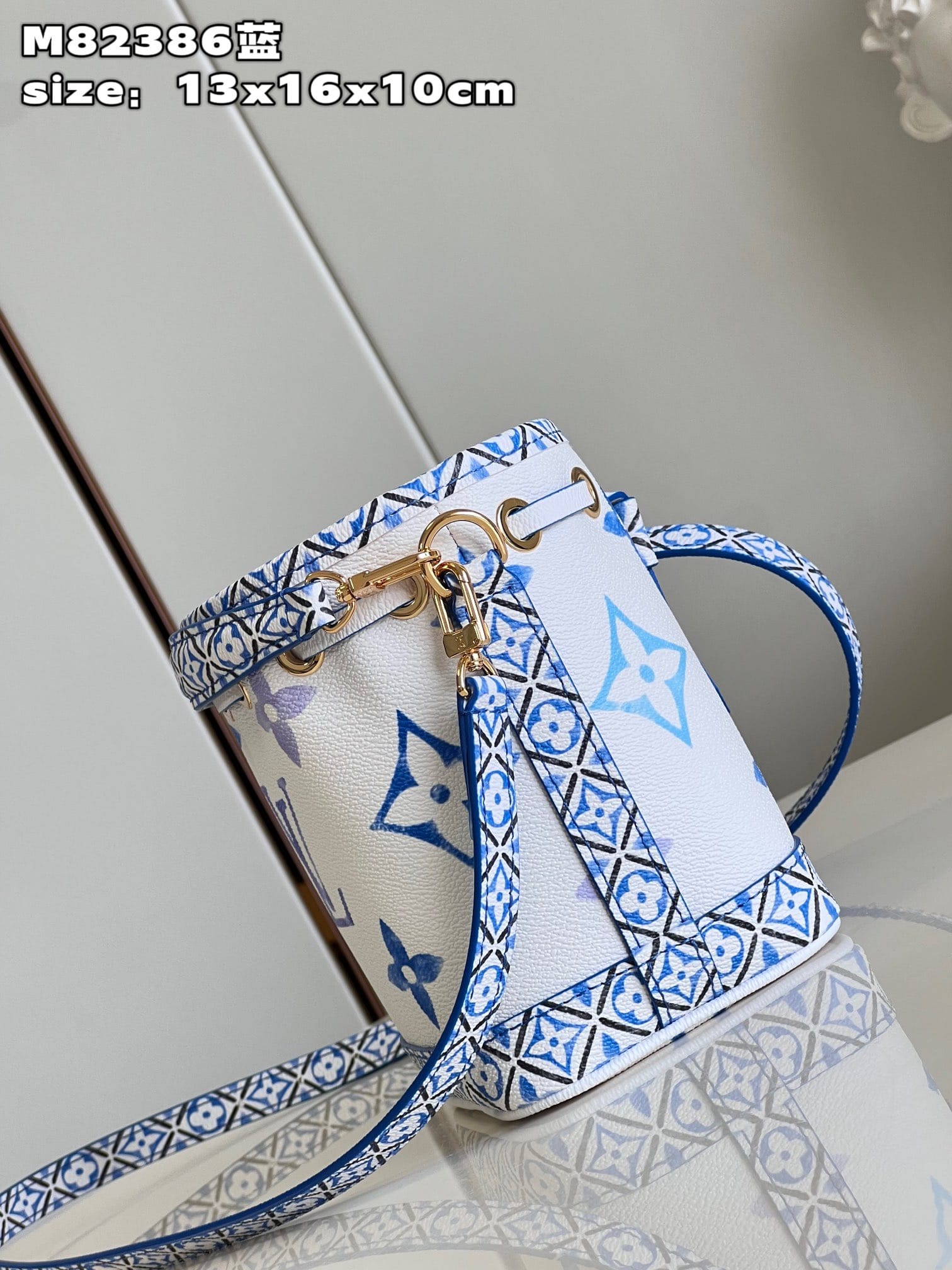【独家实拍 M82386蓝 】本款 Nano Noé 手袋出自当季度假系列,以盛夏色彩描摹涂层帆布表面的大号 Monogram 图案,搭配抽绳、可拆卸手柄和可拆卸并调节的肩带,共同再塑经典 Noé 手袋的袖珍版本。size:13x16x10cm (长度 x 高 x 宽)