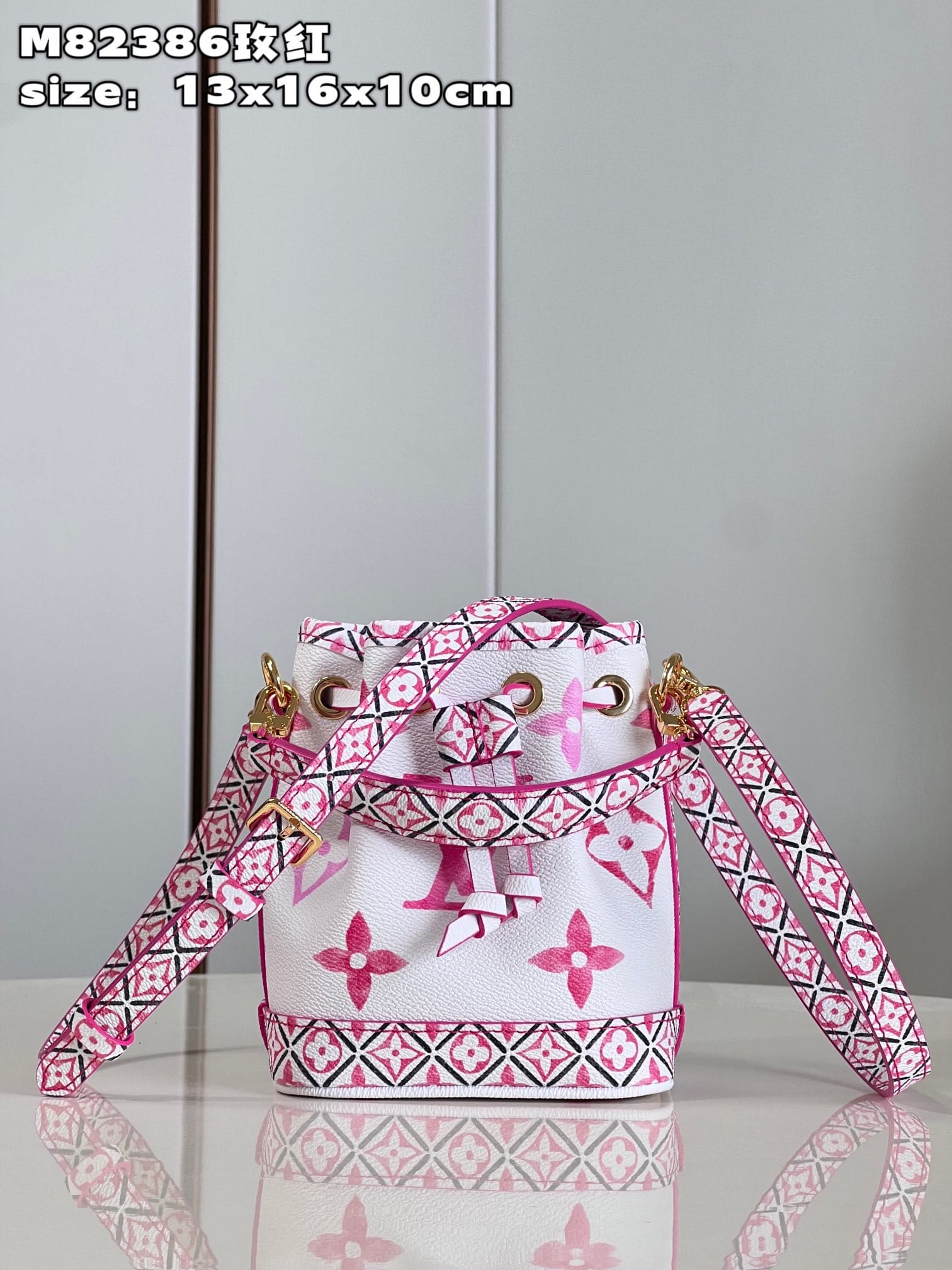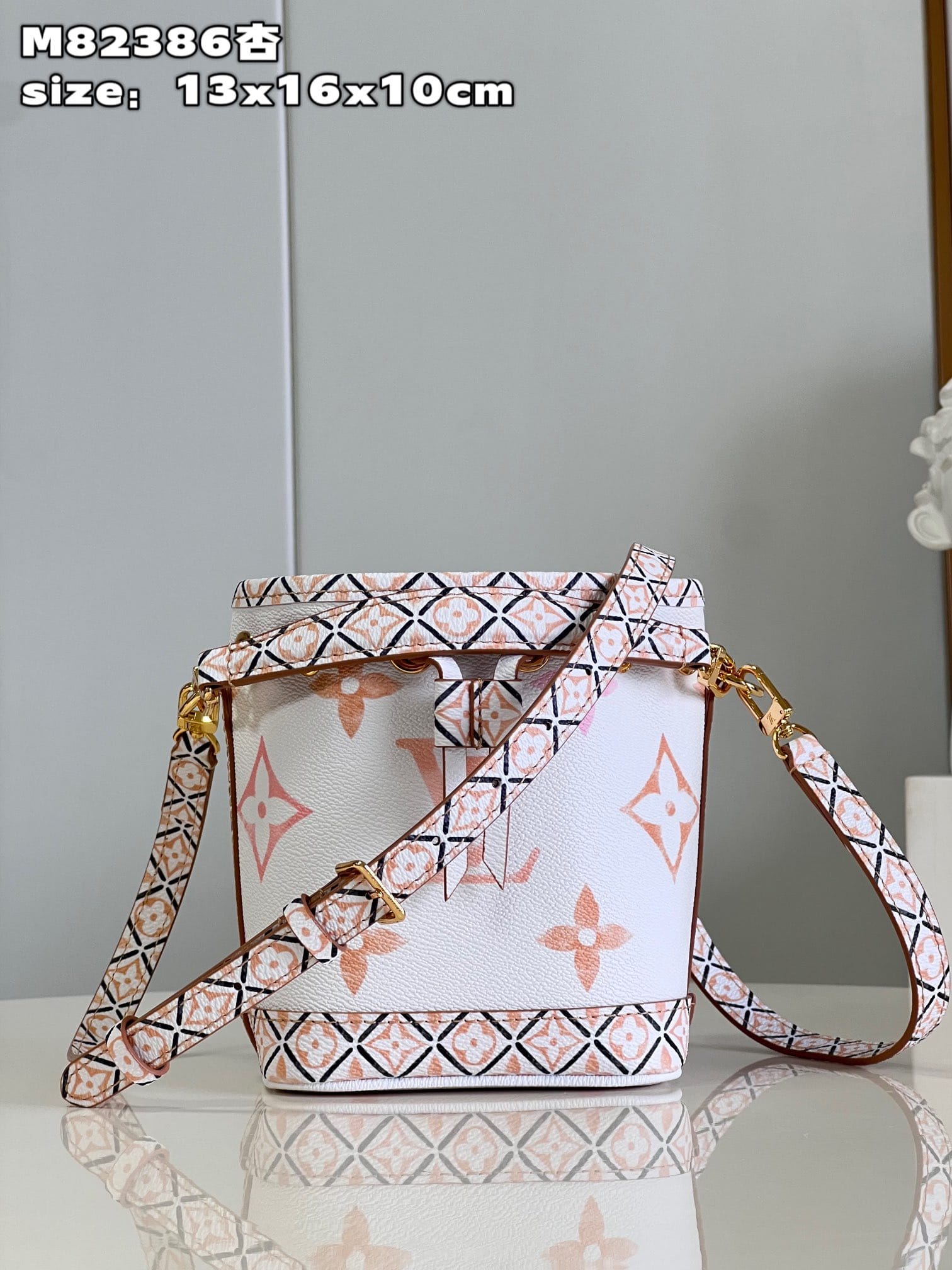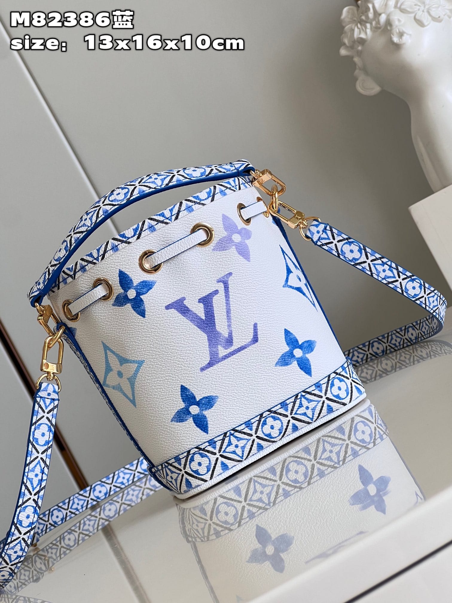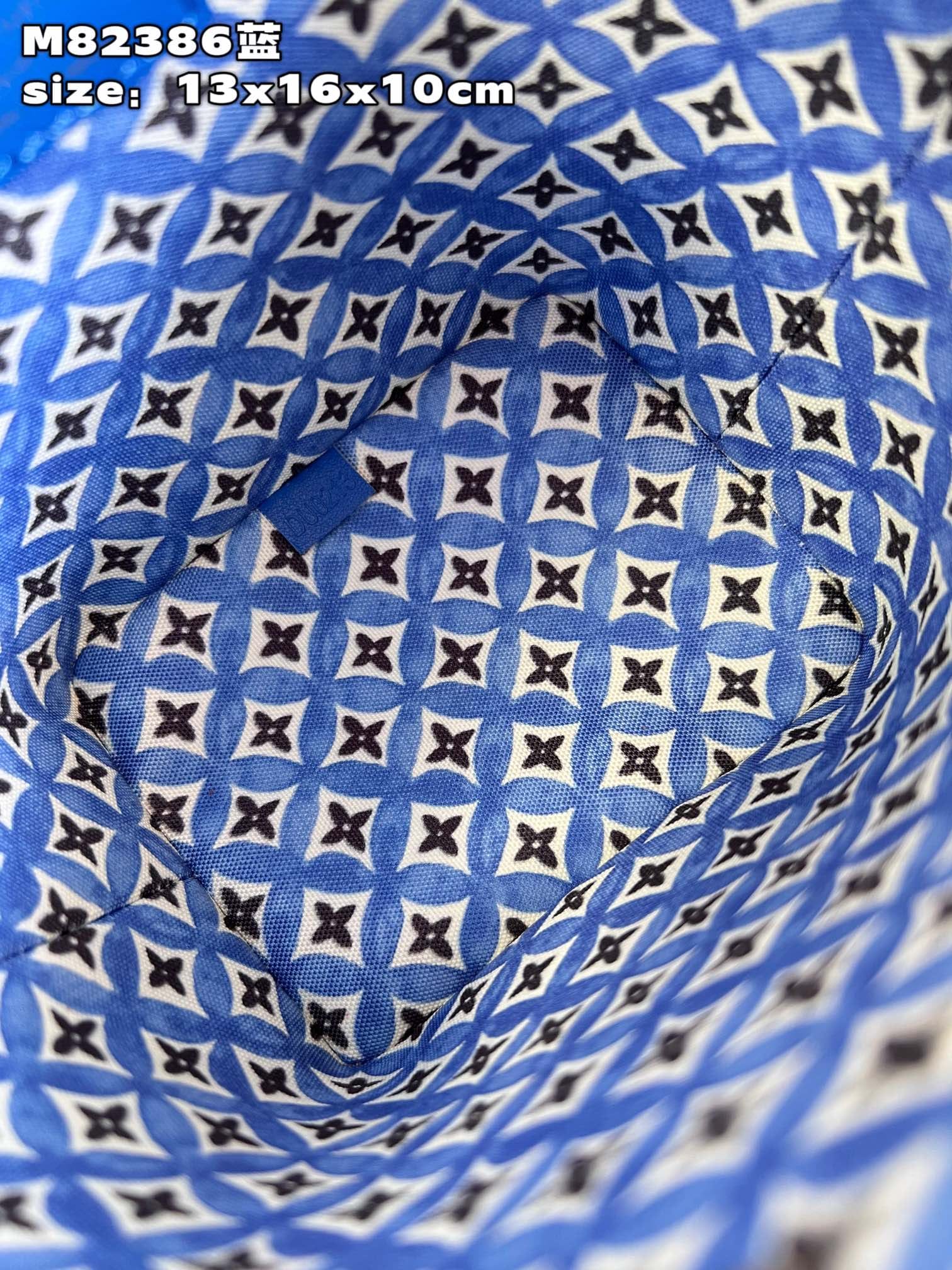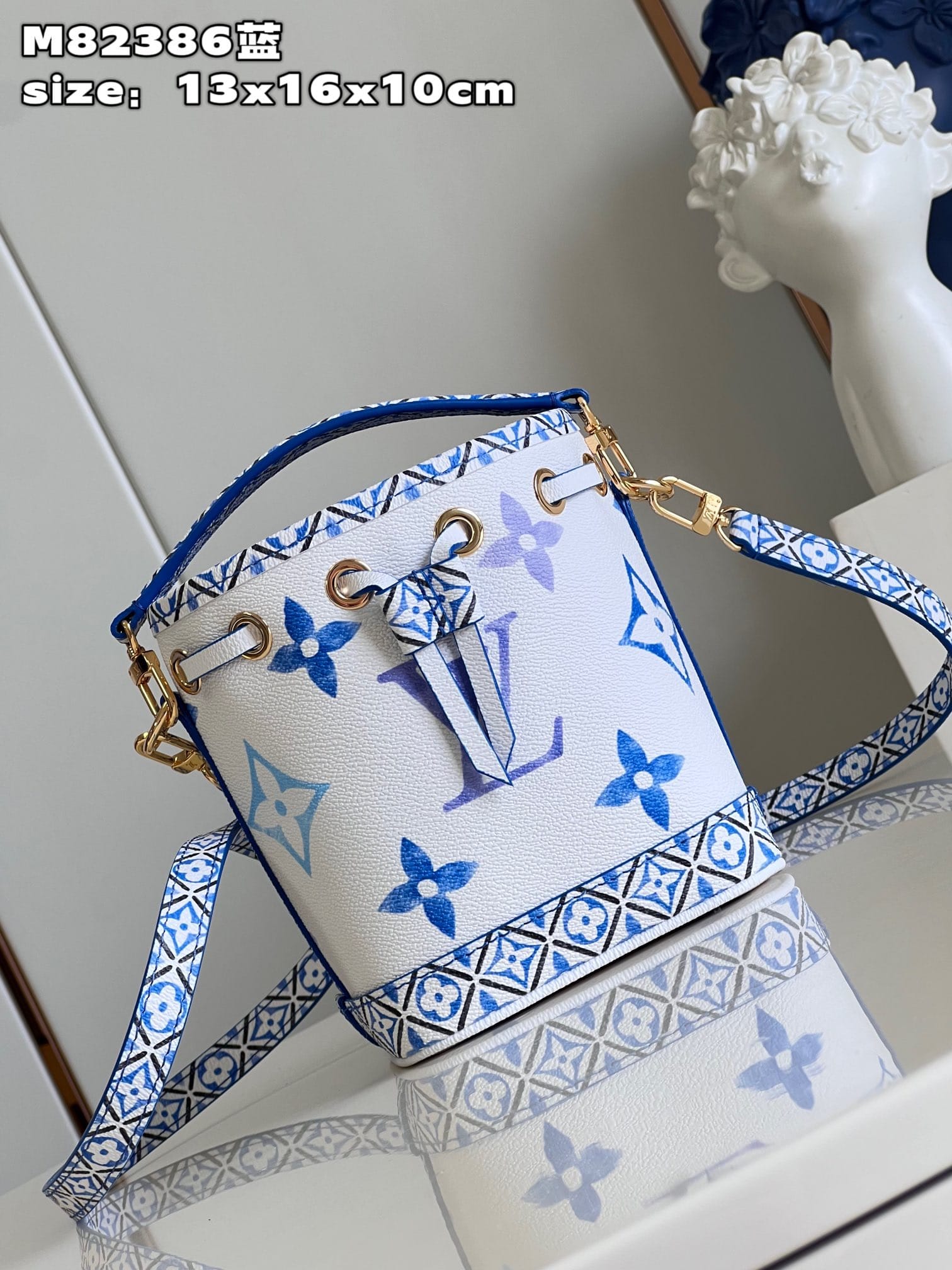 【独家实拍 M82386蓝 】本款 Nano Noé 手袋出自当季度假系列,以盛夏色彩描摹涂层帆布表面的大号 Monogram 图案,搭配抽绳、可拆卸手柄和可拆卸并调节的肩带,共同再塑经典 Noé 手袋的袖珍版本。size:13x16x10cm (长度 x 高 x 宽)