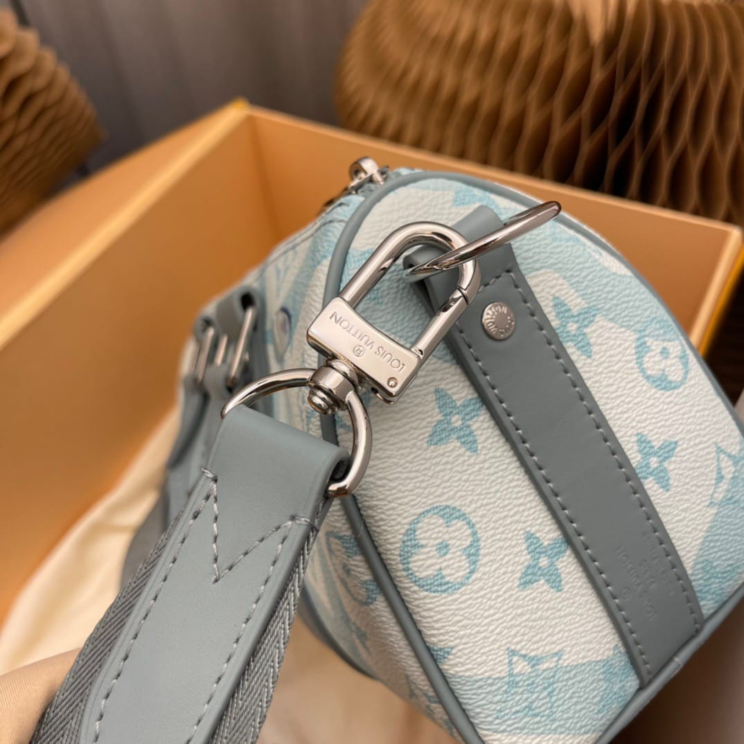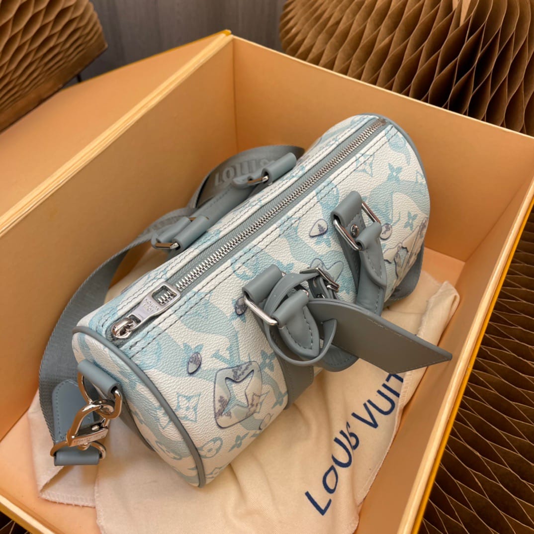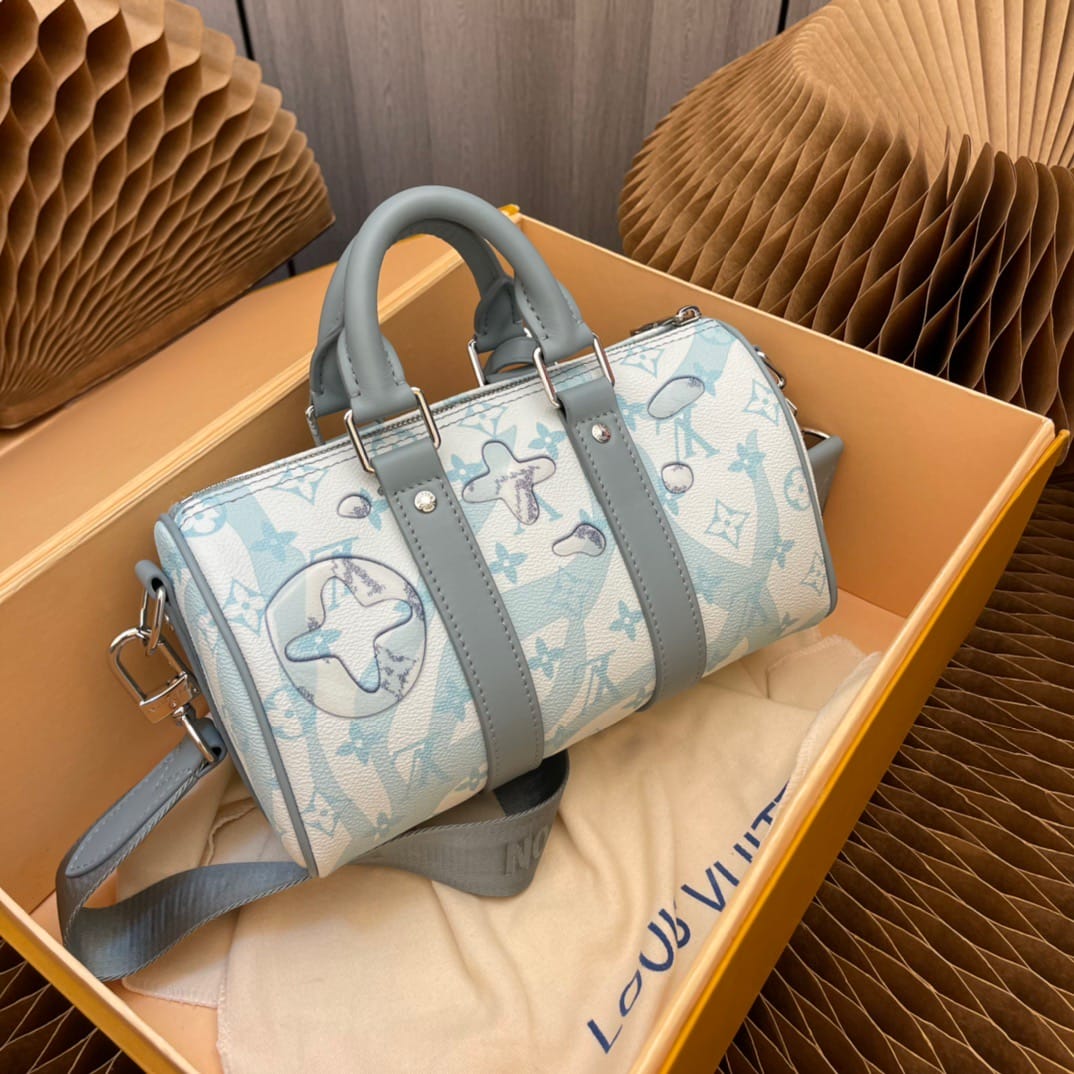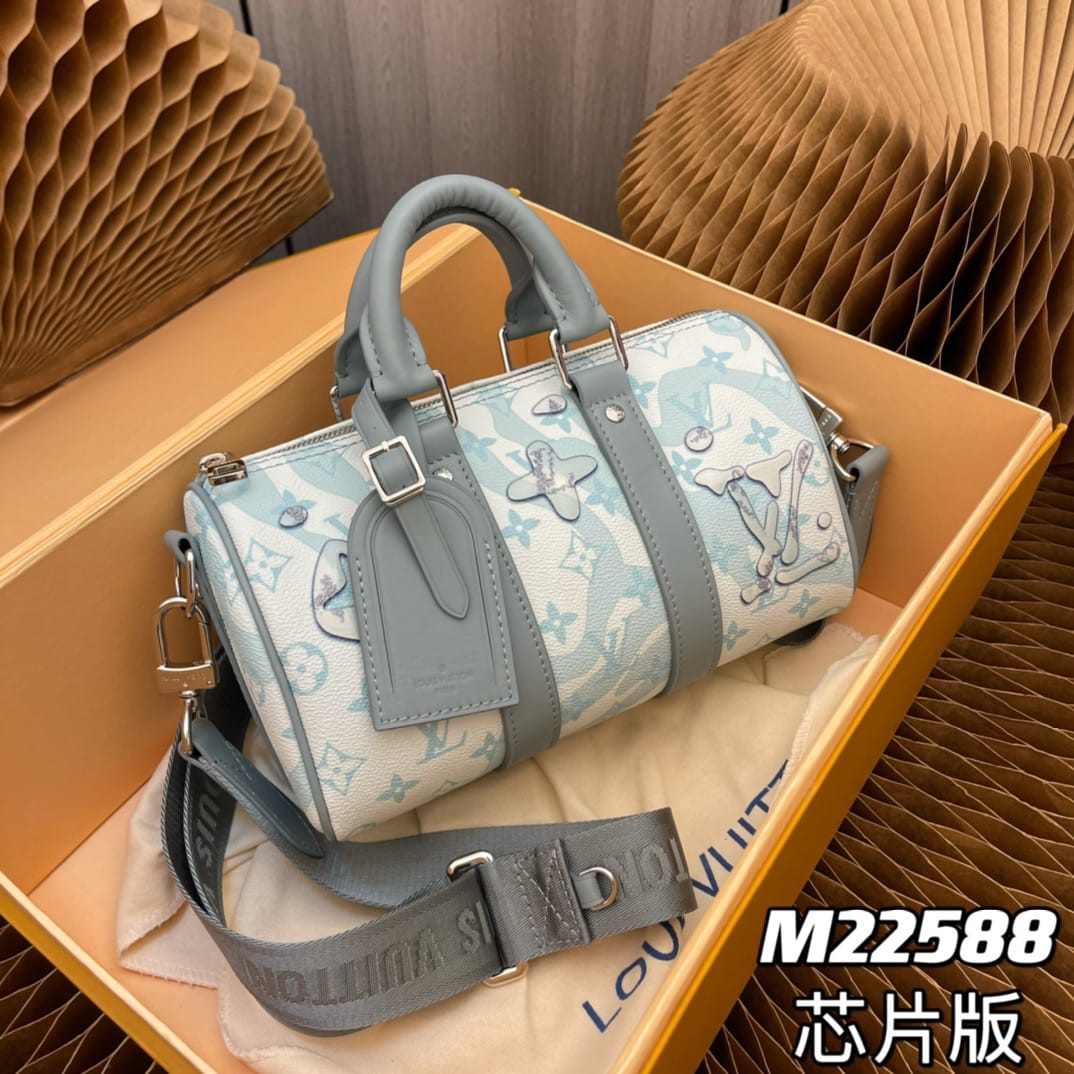 原单加强版?【独家实拍背景图】 M22527 水滴款、男包枕头包keepall系列 KEEPALL BANDOULI?RE 25 手袋 本款 Keepall Bandoulière 25 手袋依托创意喷墨印制工艺,仿佛水滴滑过 LV 字母和 Monogram 花卉表面,彰显 Monogram Aquagarden 帆布的立体观感。紧凑构型搭配加固侧带和皮革名牌,延续 Keepall 系列的一贯设计。