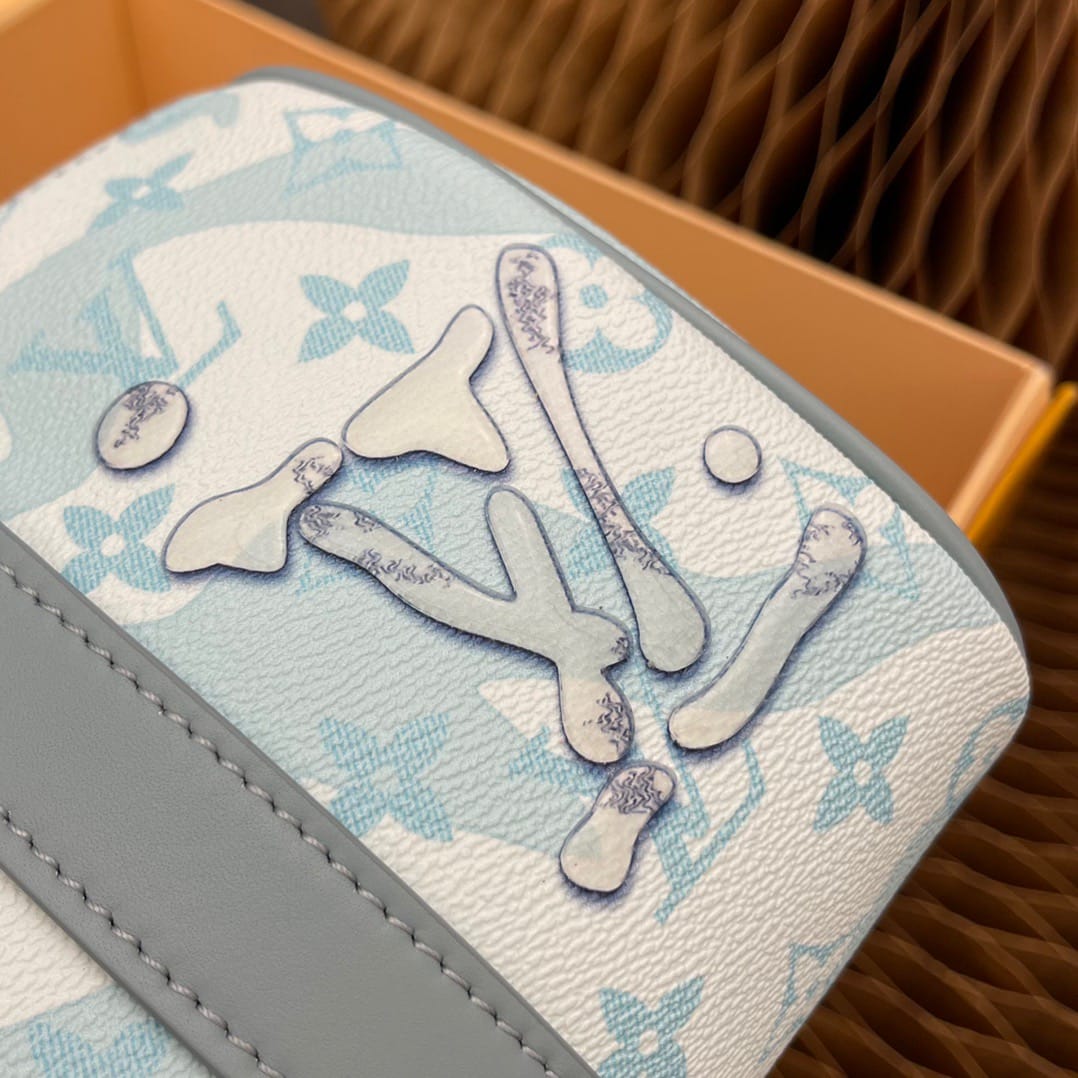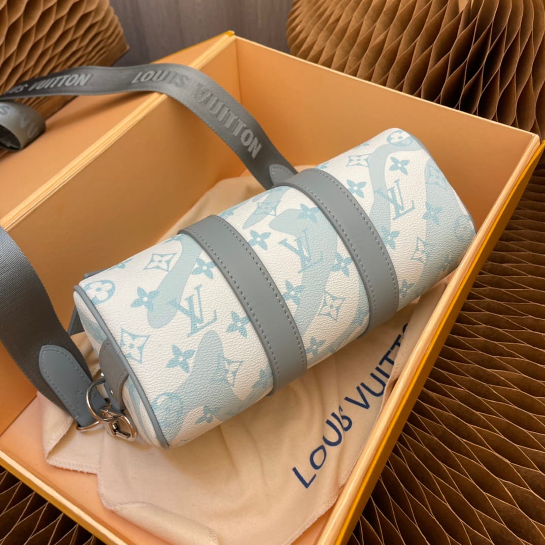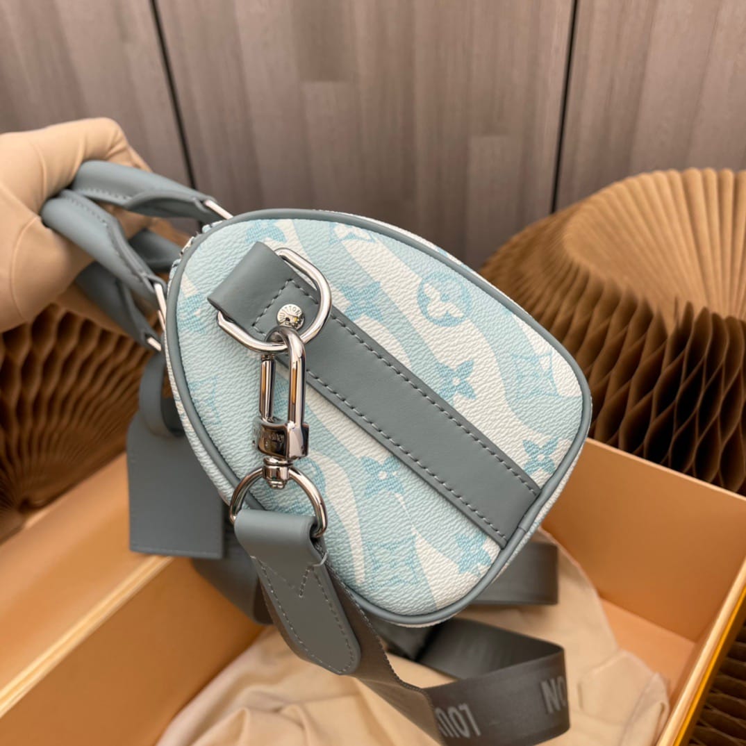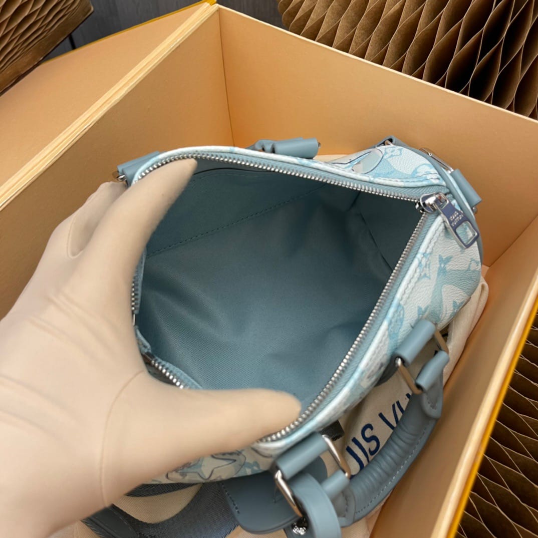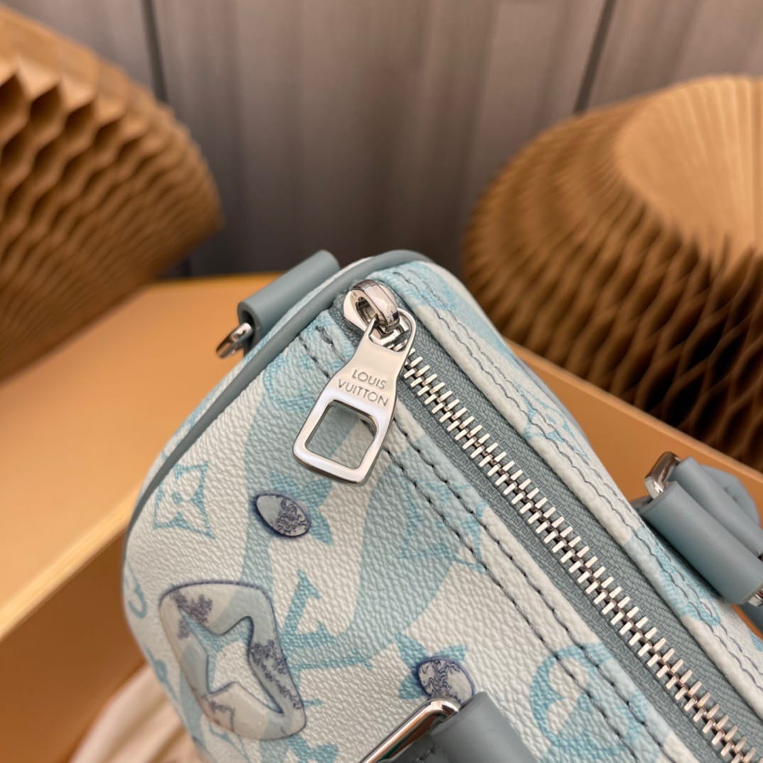 原单加强版?【独家实拍背景图】 M22527 水滴款、男包枕头包keepall系列 KEEPALL BANDOULI?RE 25 手袋 本款 Keepall Bandoulière 25 手袋依托创意喷墨印制工艺,仿佛水滴滑过 LV 字母和 Monogram 花卉表面,彰显 Monogram Aquagarden 帆布的立体观感。紧凑构型搭配加固侧带和皮革名牌,延续 Keepall 系列的一贯设计。