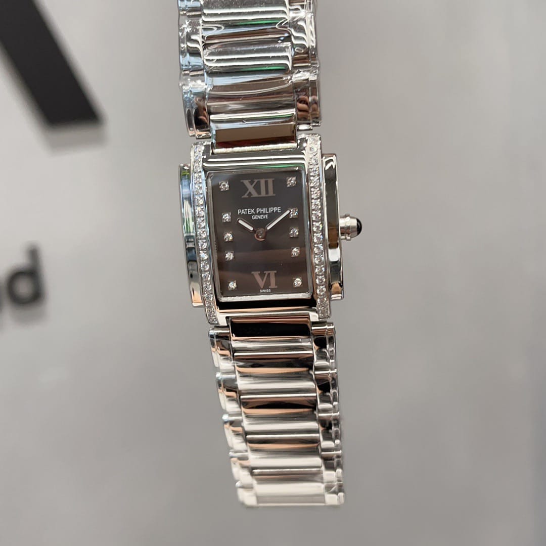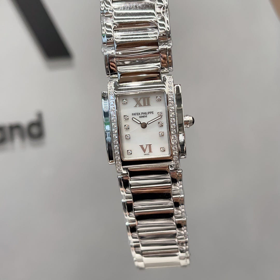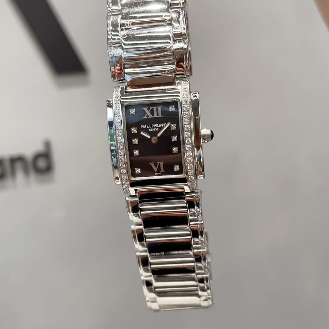 百达翡丽Twenty-4系统专为女性打造的腕表,双层微弧矩形表壳影显匠心独运的装饰艺术风格。表盘两侧各嵌18颗钻石。表链由三排全手工抛光链节组成,搭配折叠式表扣,完美贴合腕部轮廓。采用瑞士进口石英机芯,走时精准。夜光指针表盘,承袭百达翡丽一以贯之的精湛工艺与匠心细节。