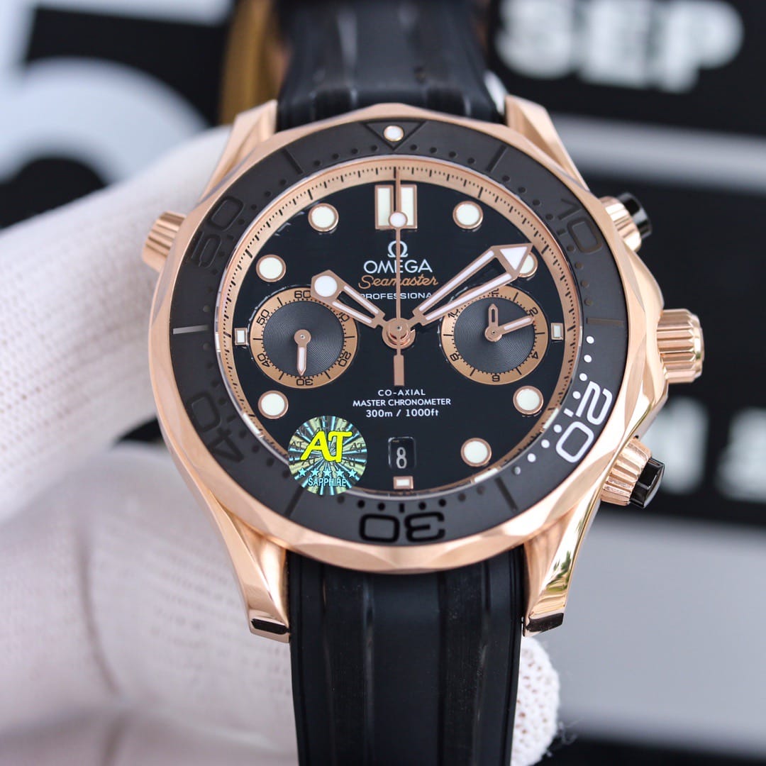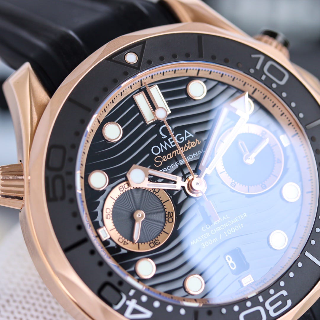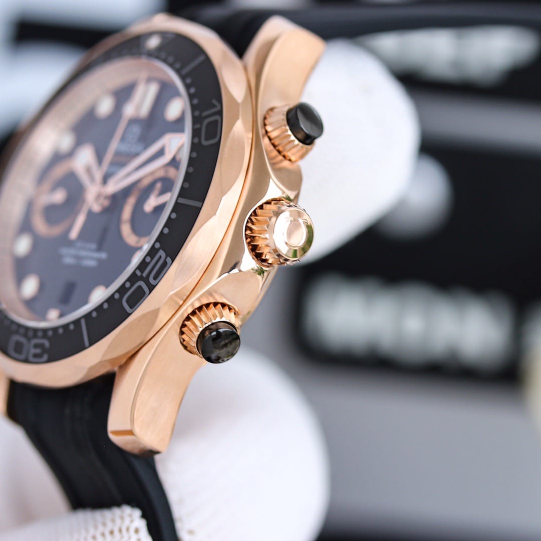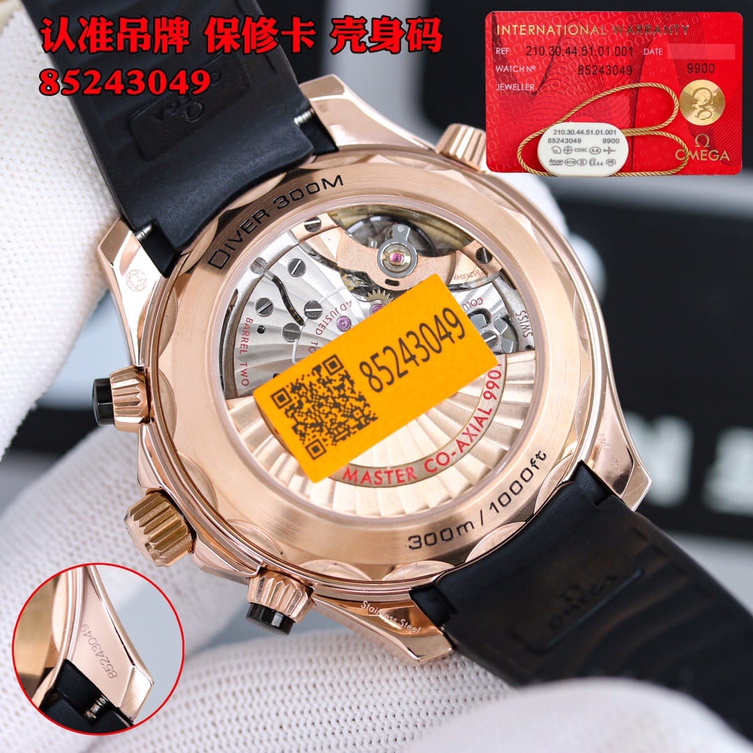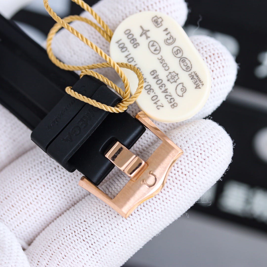 1: 搭载复刻米欧茄9900计机时芯,904精表钢壳44毫米 ,天进然口橡胶表带 。OMEGA 独家 Sedna 金自然是最重要的装饰金属,你可以在表圈、表冠按钮、表盘上看到这种迷人温暖的金红色。表圈刻度圈以激光烧蚀出喷砂效果,抛光的数字与刻度则如浮雕般凸出。