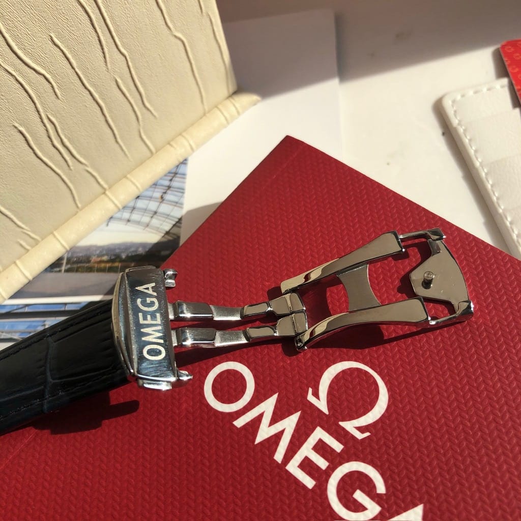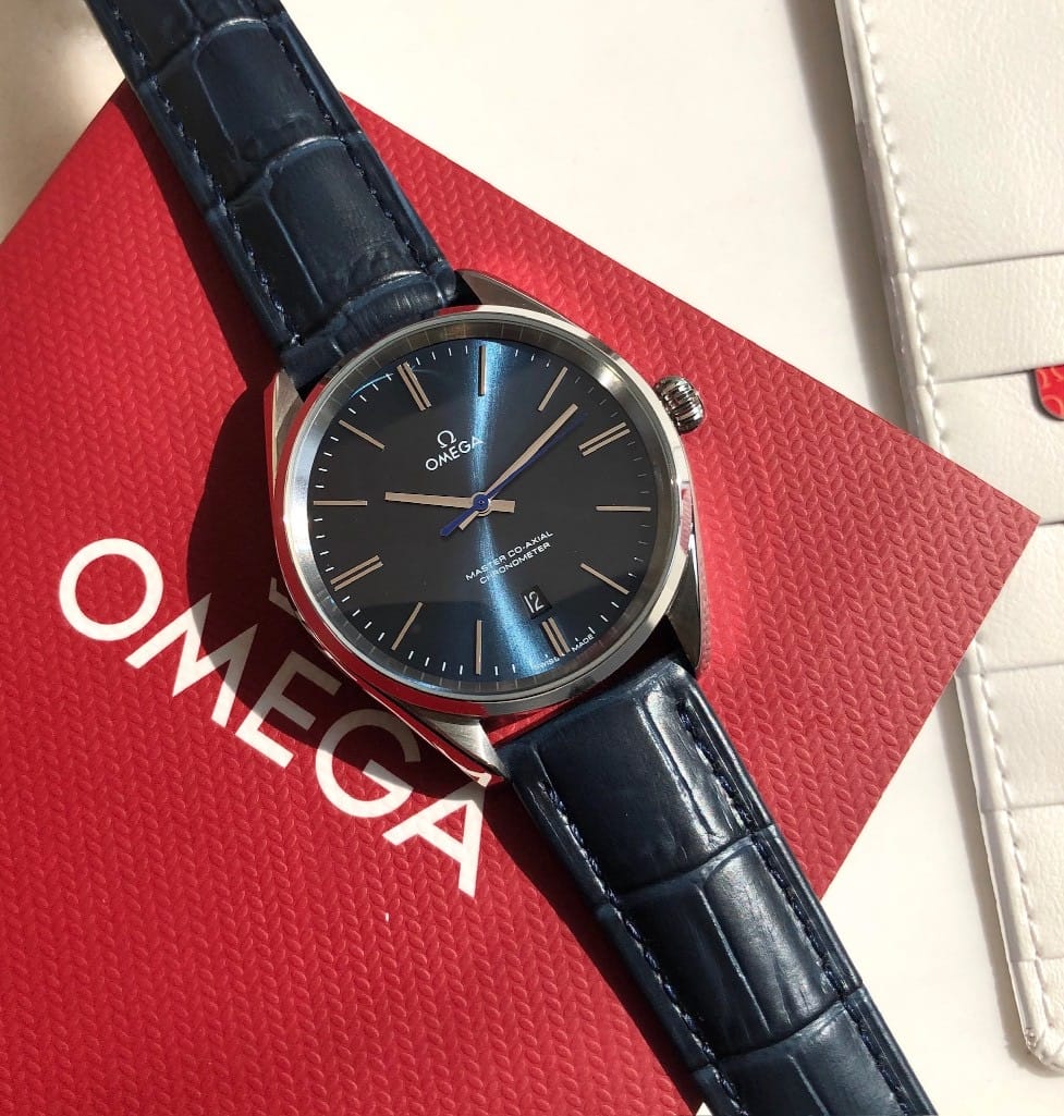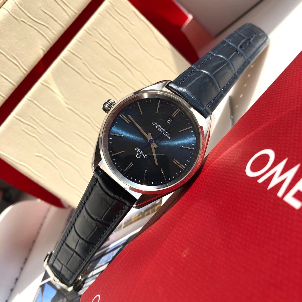 【字面】采用原装同步弧形面盘,镶嵌简洁蓝色条钉刻度,全网唯一烤蓝表针同步镜片、字面弧度,6点位置日历显示