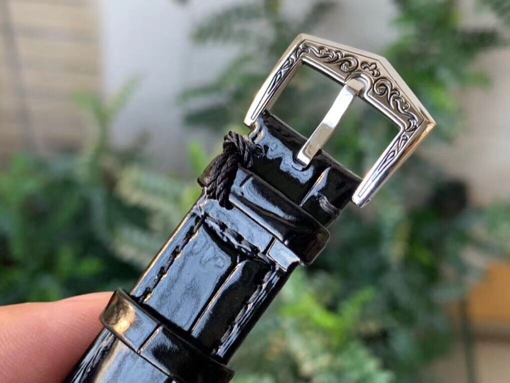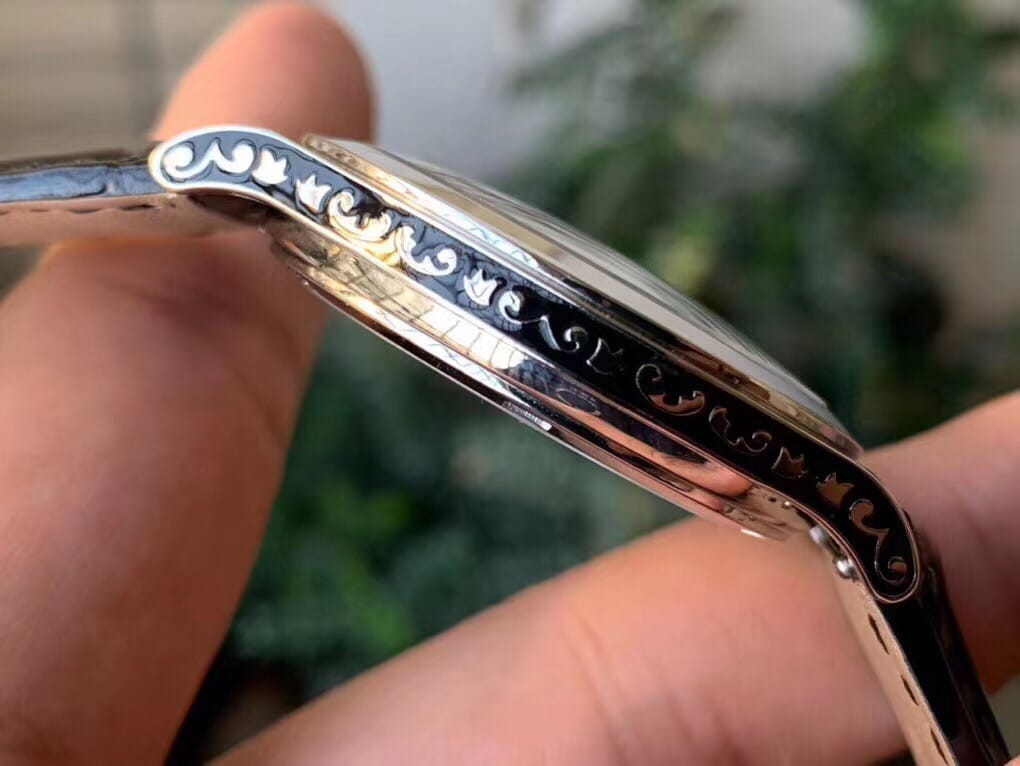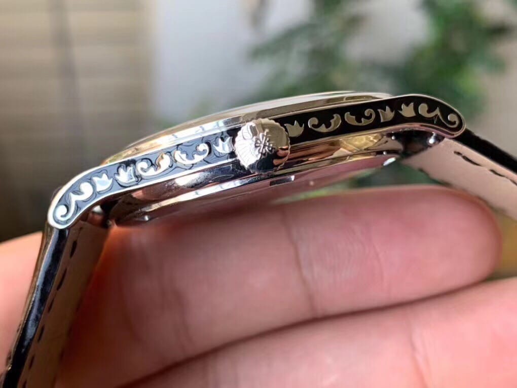 优雅百搭的Calatrava雕花表壳极具个性,38.6毫米的表经适配大众男性手寸,非常商务可亦?休闲。整表(表壳 表盘 表扣)以黑色搪瓷再饰以漩涡图案和藤蔓花纹,视觉冲击力强,令人过目不忘,实物质感更加优美。 机芯同样诚意满满,极致复刻了百达翡丽Cal.240机芯,搭载定制版原生两针珍珠陀机芯(无日历档),可大大降低故障率。机芯共含315个零件,12个夹板,45颗宝石,振频28800次/小时,最大动力存储可达48小时。