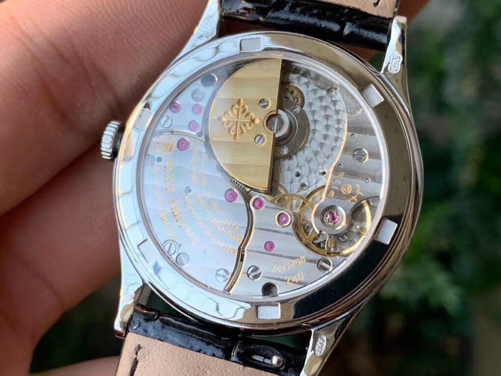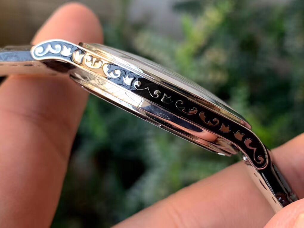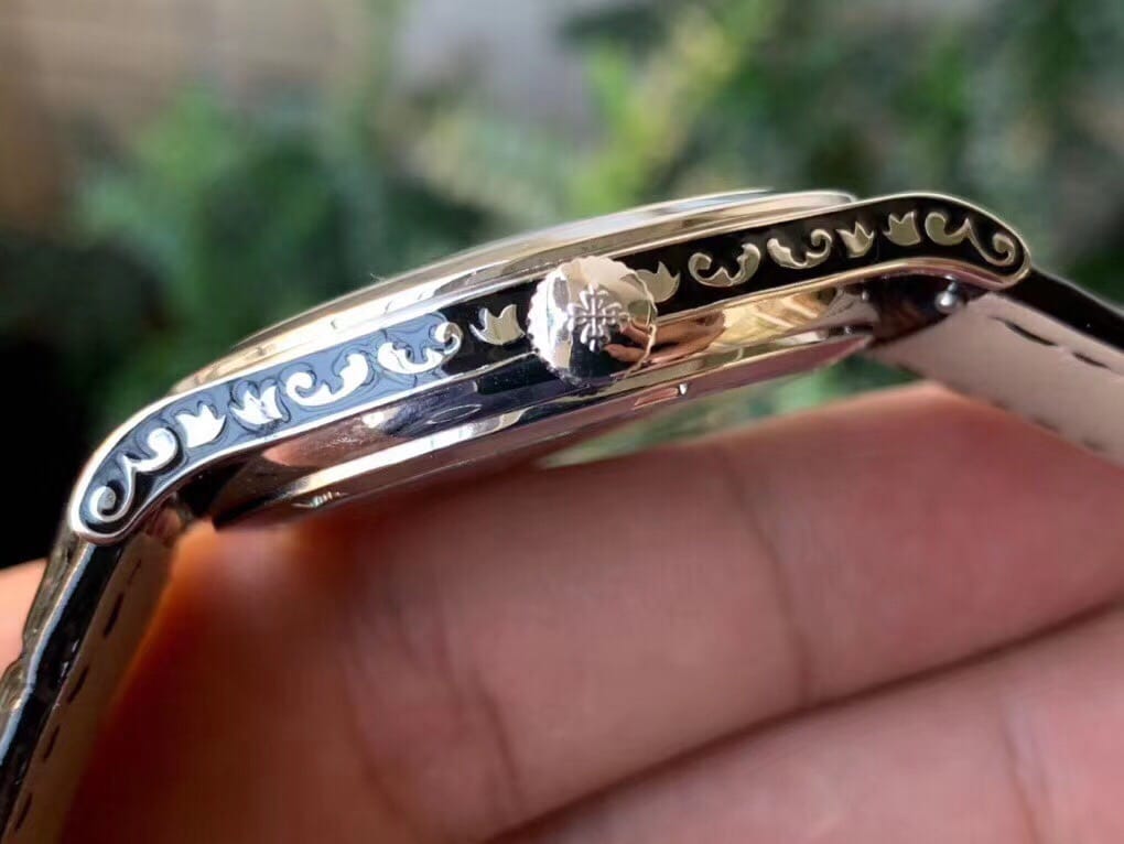 优雅百搭的Calatrava雕花表壳极具个性,38.6毫米的表经适配大众男性手寸,非常商务可亦?休闲。整表(表壳 表盘 表扣)以黑色搪瓷再饰以漩涡图案和藤蔓花纹,视觉冲击力强,令人过目不忘,实物质感更加优美。 机芯同样诚意满满,极致复刻了百达翡丽Cal.240机芯,搭载定制版原生两针珍珠陀机芯(无日历档),可大大降低故障率。机芯共含315个零件,12个夹板,45颗宝石,振频28800次/小时,最大动力存储可达48小时。