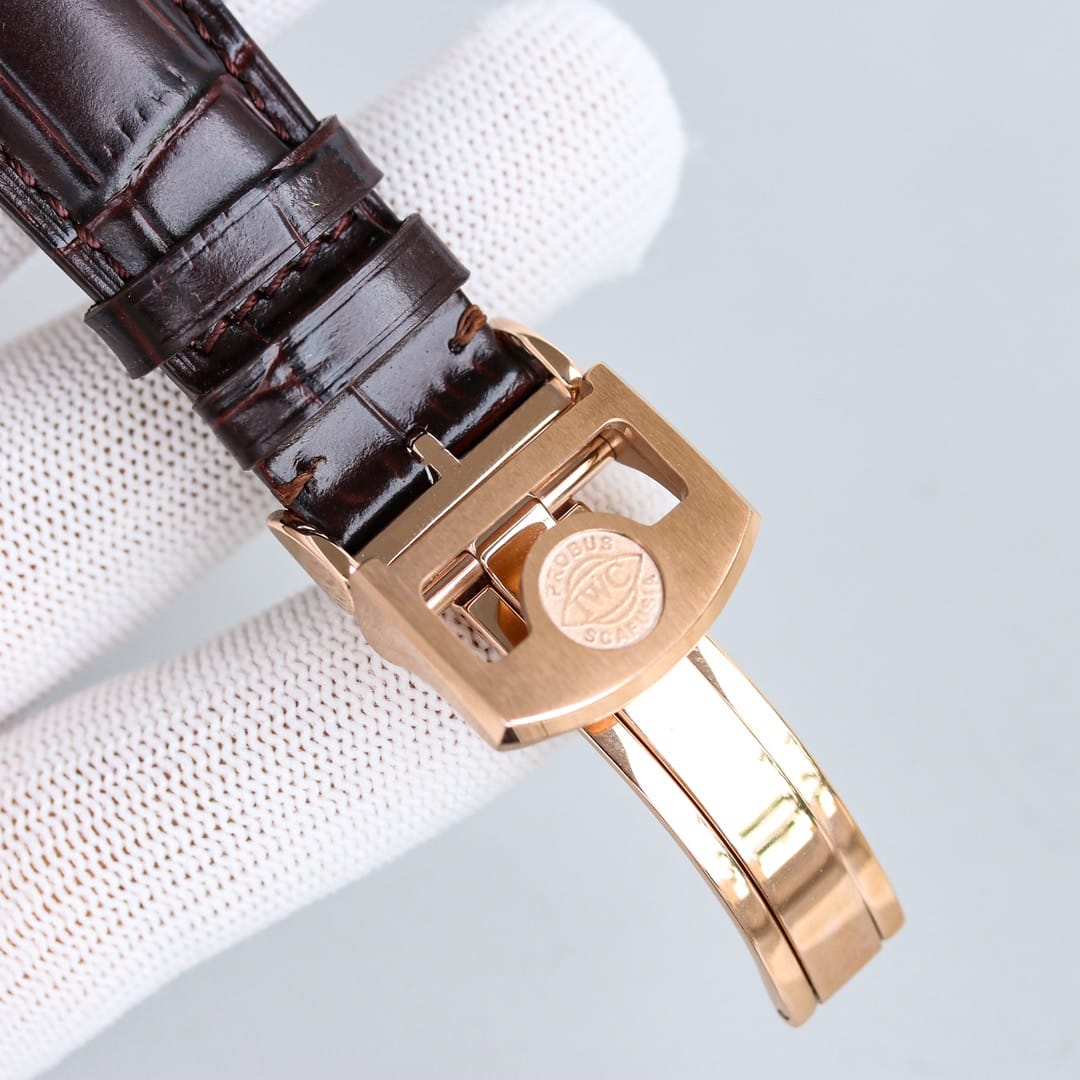 将葡萄牙系列历久弥新的现代设计与6点钟位置的飞行分钟陀飞轮融为一体 金镶贴阿拉伯数字搭配金质叶形指针,与镀银表盘和谐呼应