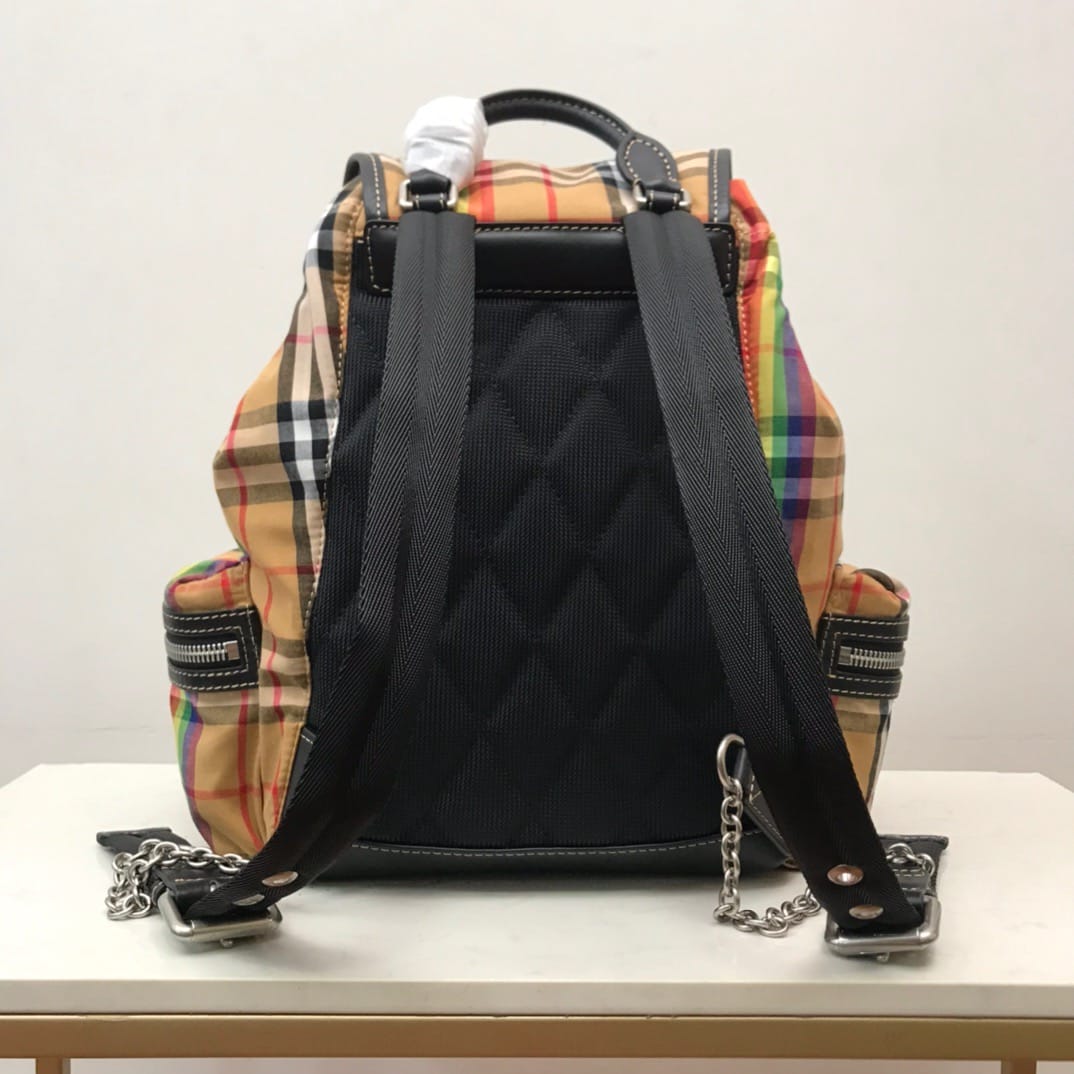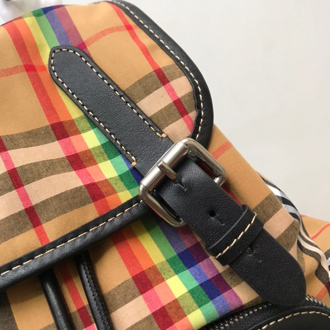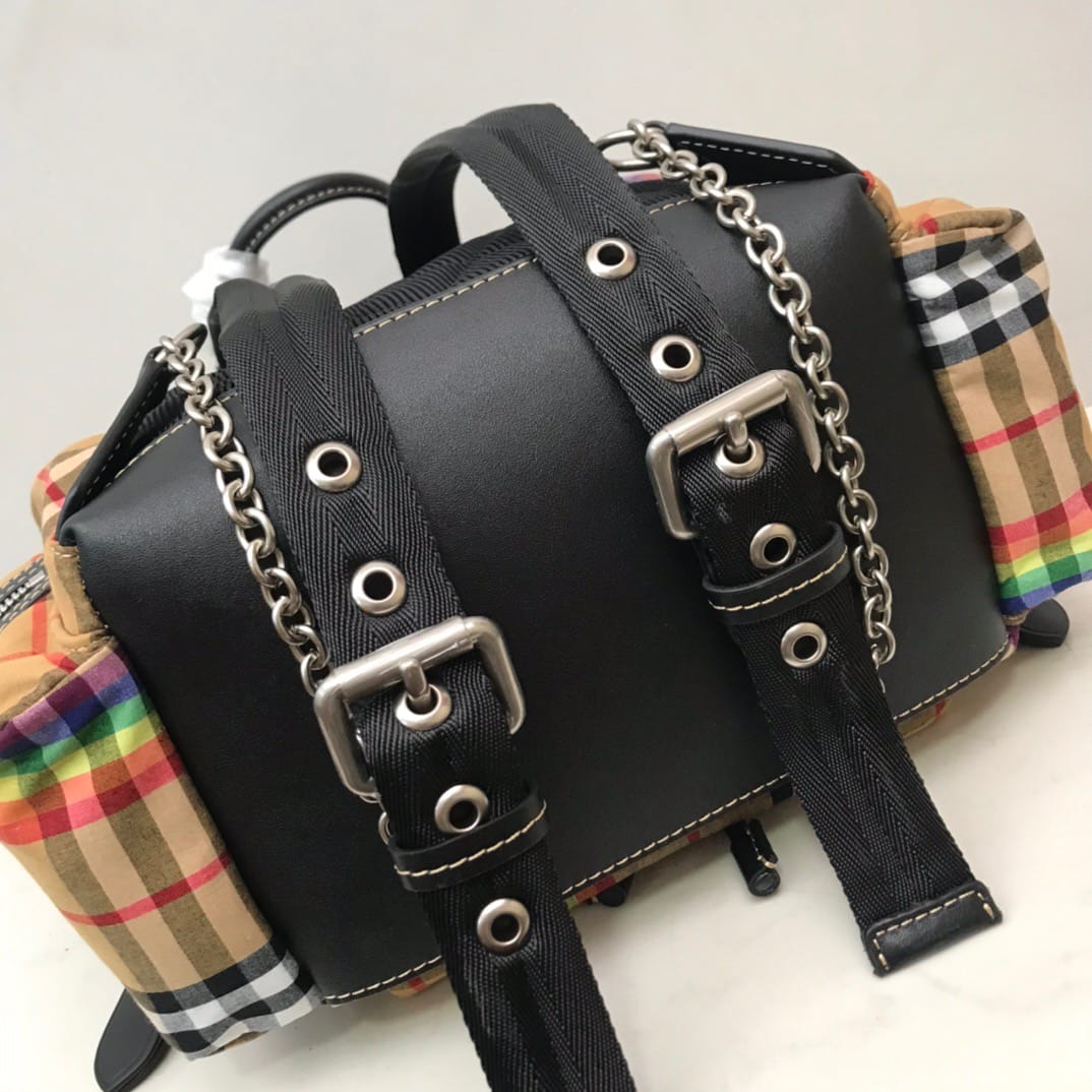【B家顶级原单】 The Rucksack - 中号 Vintage 格纹拼皮革军旅背包,多隔层,皮革顶部提柄;可调式帆布拼链饰肩背带,扣环、按扣与抽绳开合。 尺寸:W22 x H33 x D14cm 款号:40731121