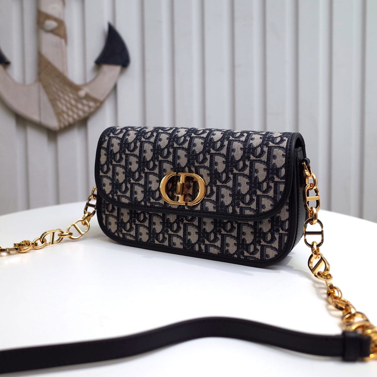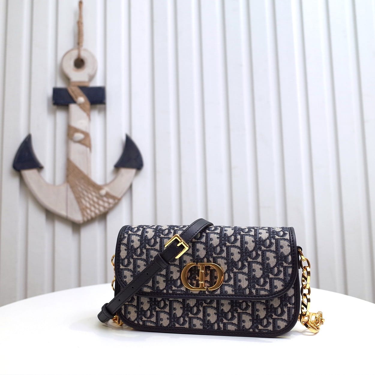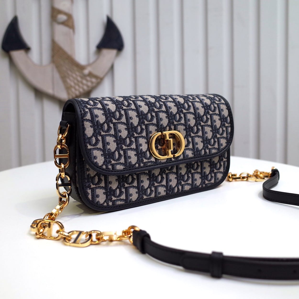 这款 30 Montaigne Avenue 手袋采用典雅的设计,提升此经典系列的格调。采用蓝色 Oblique 印花面料精心制作,圆角翻盖曲线精致,饰以复古金色饰面金属 CD 扣环,灵感源自 Christian Dior 香水瓶的封口。背面饰以压花 30 Montaigne 标志,搭配由金色饰面金属和与皮革同色调的珐琅链环交替组成的经典链条。褶层设计,空间宽敞,廓形精致,可手提、肩背或斜挎。