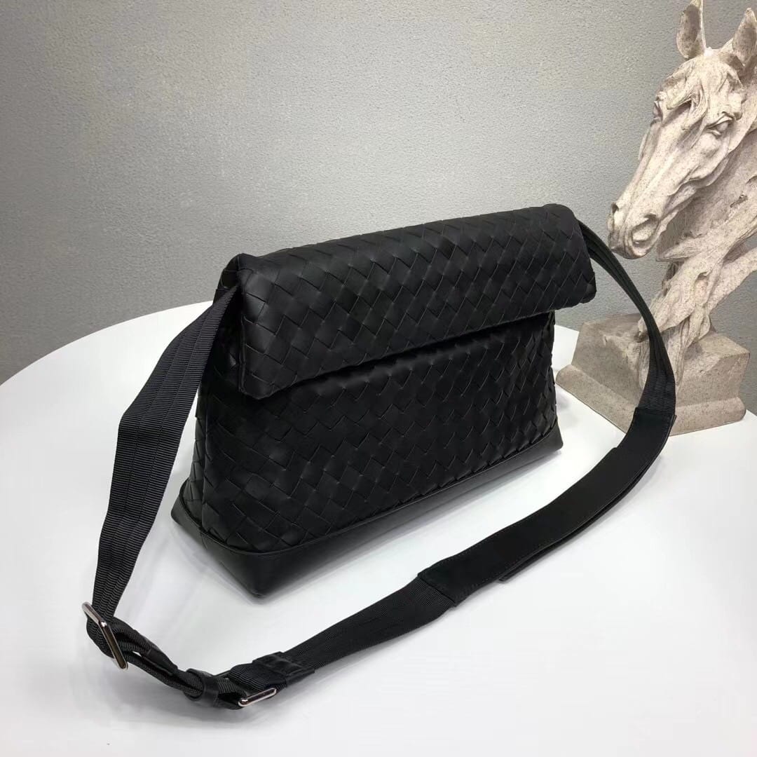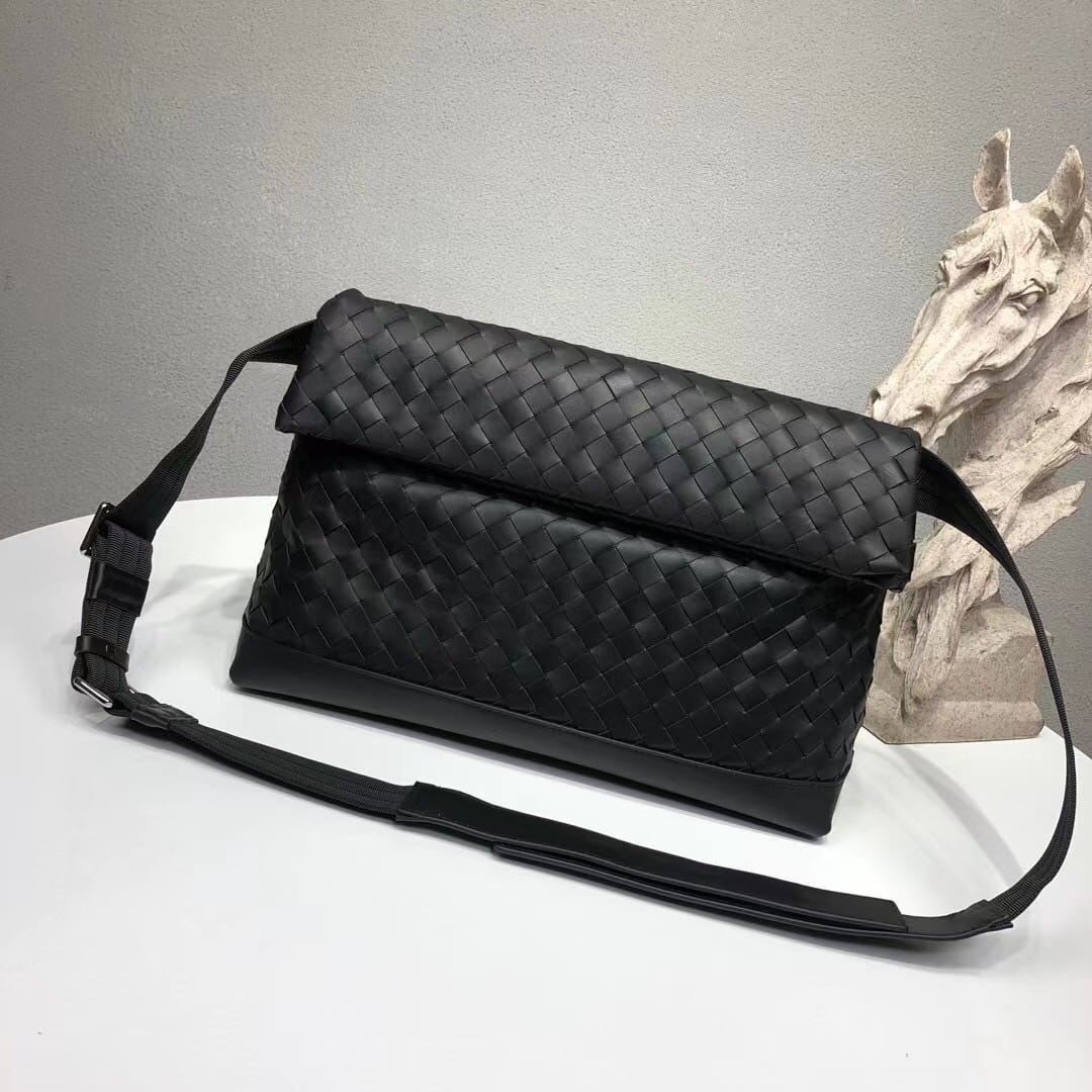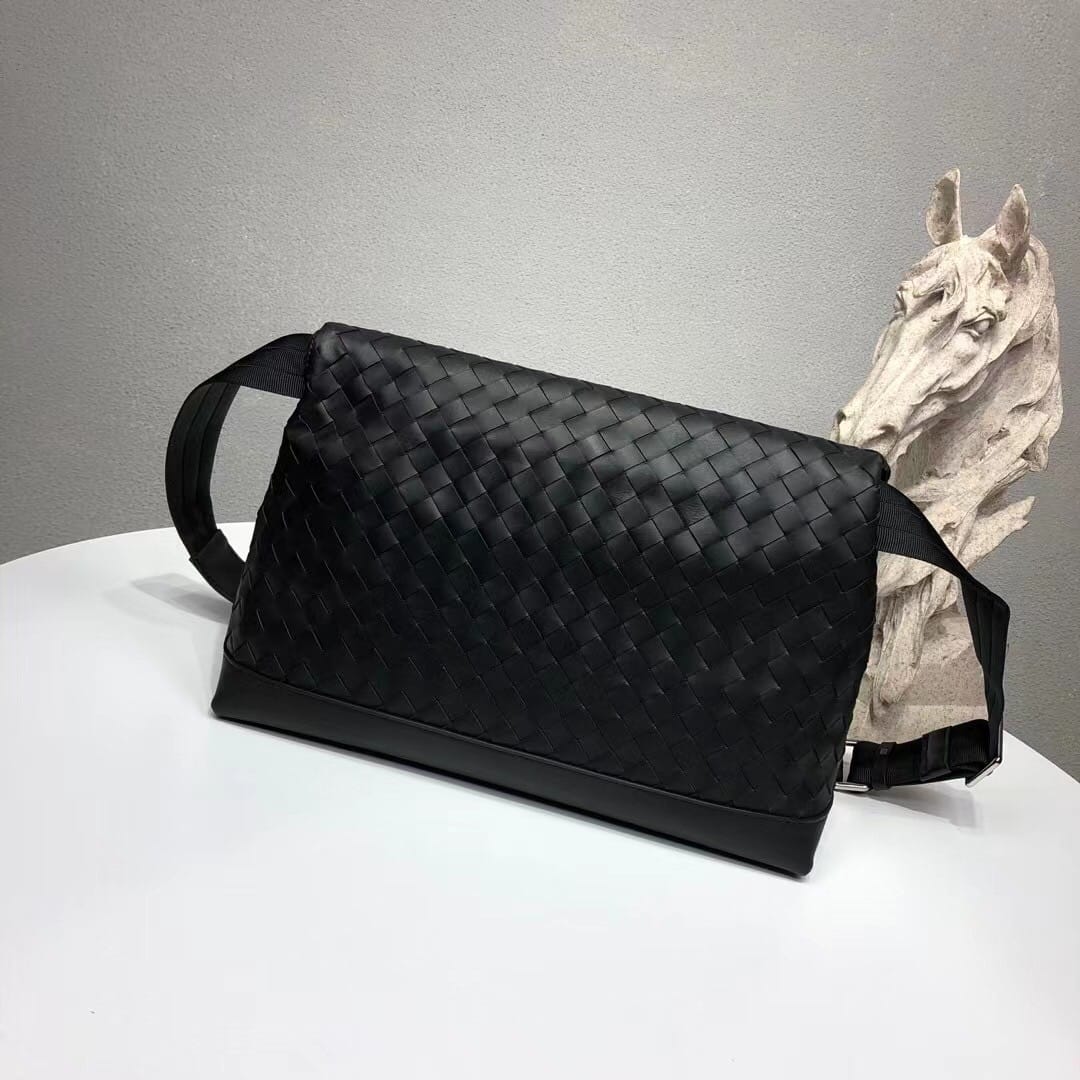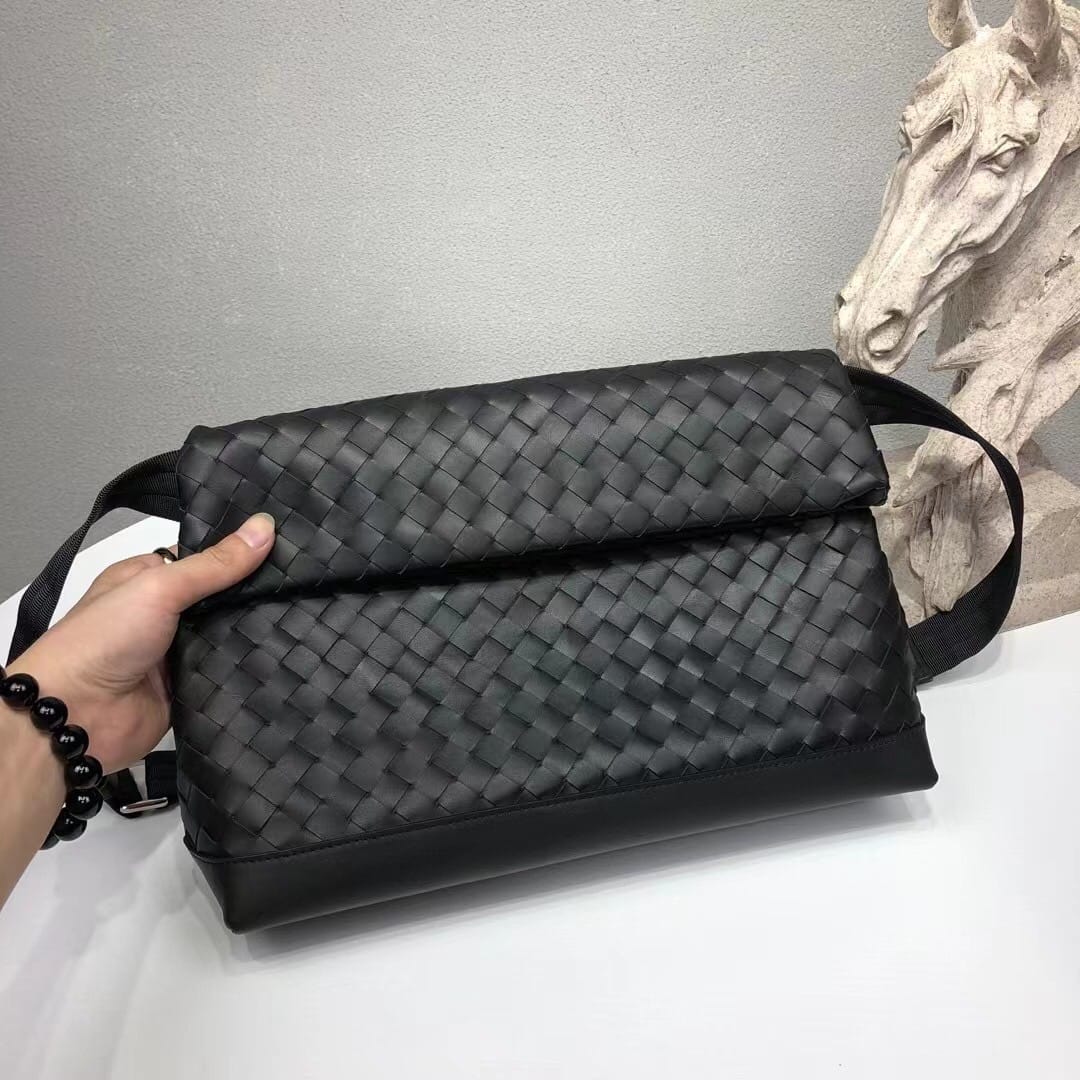 BOTTEGA VENETA葆蝶家经典男女同款进口打蜡牛皮邮差包? ?INTRECCIATO编织HYDROLOGY皮革邮差包 ?可折叠顶部 ?可调节可拆卸丝质肩带 ?边框开合 ?内部采用棉灰里布,五金采用银色抛光 ?规格:34*25*12cm