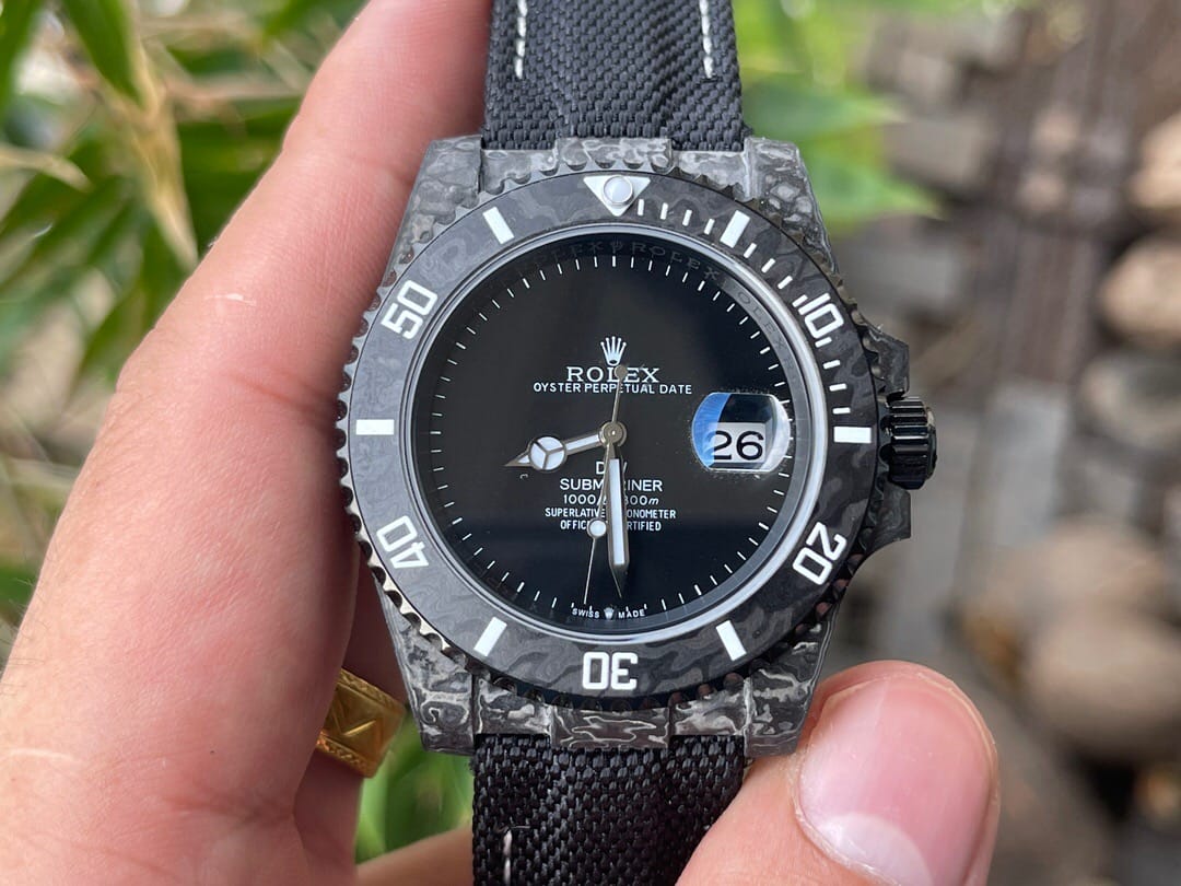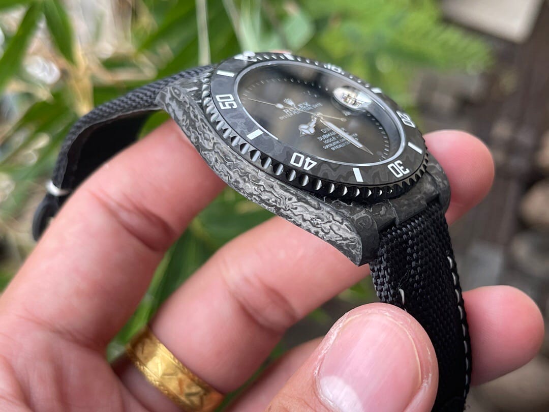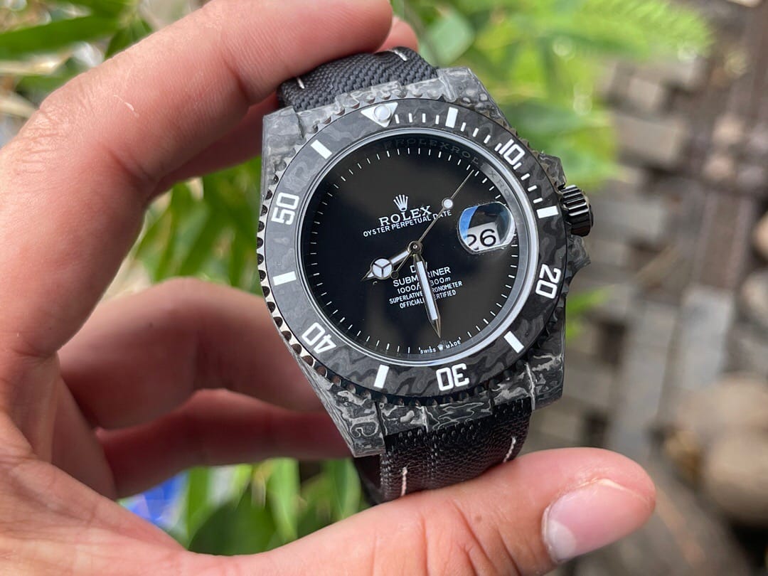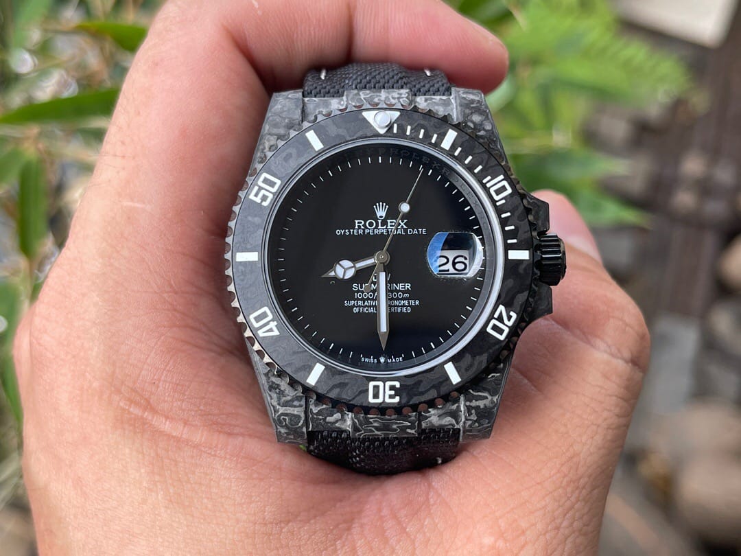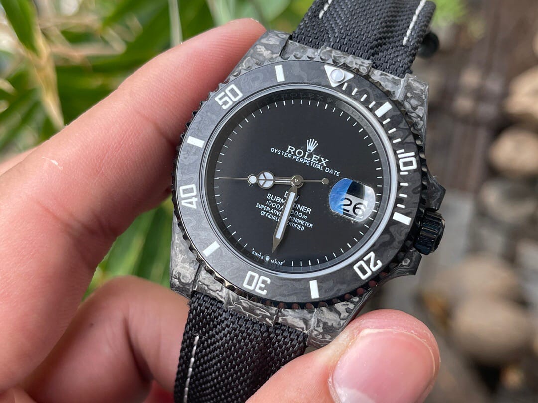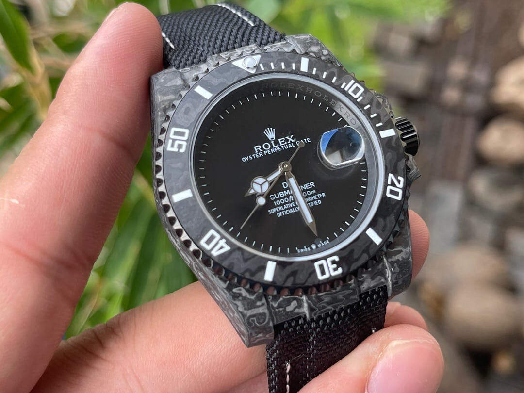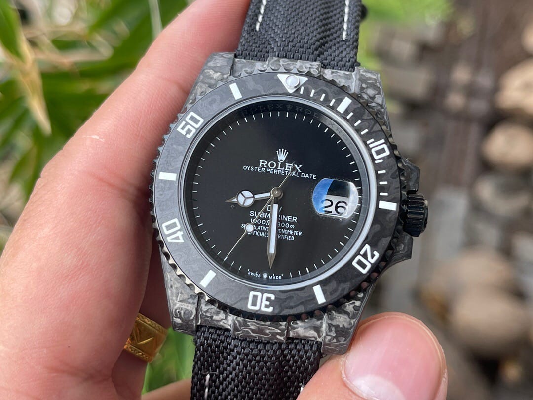 Diw定制新款 1,可以互换原装3135机芯,玩原装改装最好的替换件; 2,真正的碳纤维壳套,颜色非常惊艳好看。而且碳纤维拥有耐磨耐刮,防水不掉色的特点,是钢壳PVD所无法比拟的。 3,极致轻量化,一个鸡蛋重量。佩戴舒适性非常好。 2023 最新!最轻!最亮!