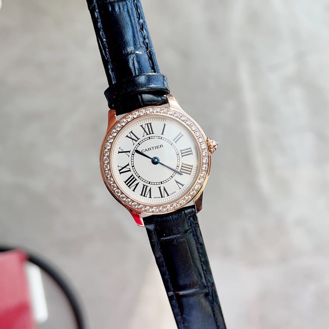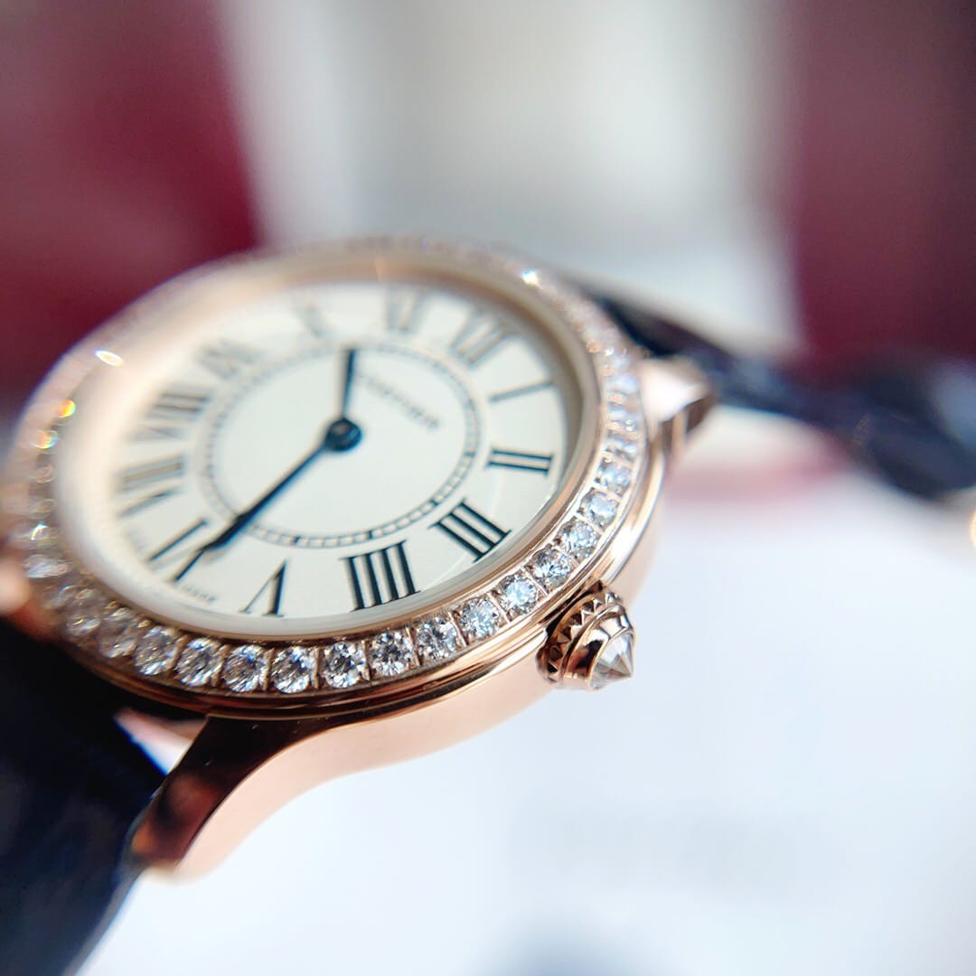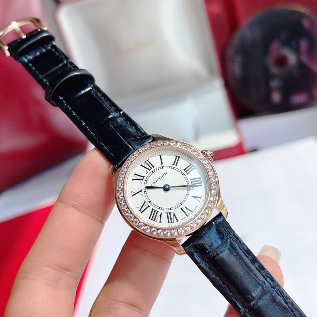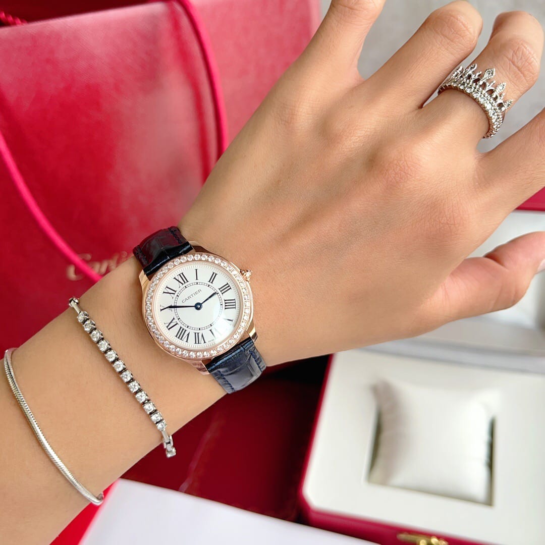RONDEMUST卡地亚新款伦敦系列腕表29mm,全新RondeMust系列腕表,承袭经典圆形造型以更流畅的表壳,压纹装饰喷砂表盘,罗马数字时标更为简洁。同时搭配更精致的凸角、全新造型的蓝宝石尖晶表冠及更丰盈圆润的外圈,瑞士进口石英机芯,316L精钢表壳表链,同款意大利纳帕细纹小牛皮表带,表带搭配便捷快拆装置,取代Rondesolo重新出发,更柔软细腻的感觉。