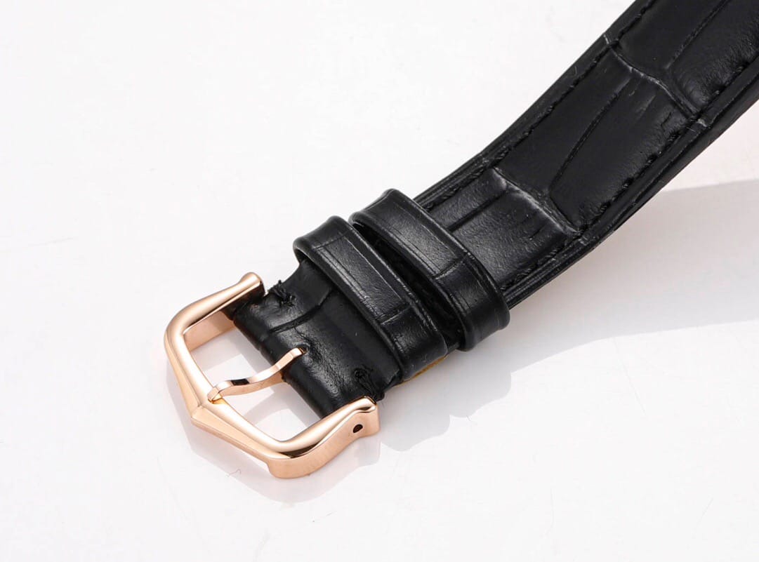 采用原装进口鳄鱼纹表带,18k玫瑰金/黄金镀表扣