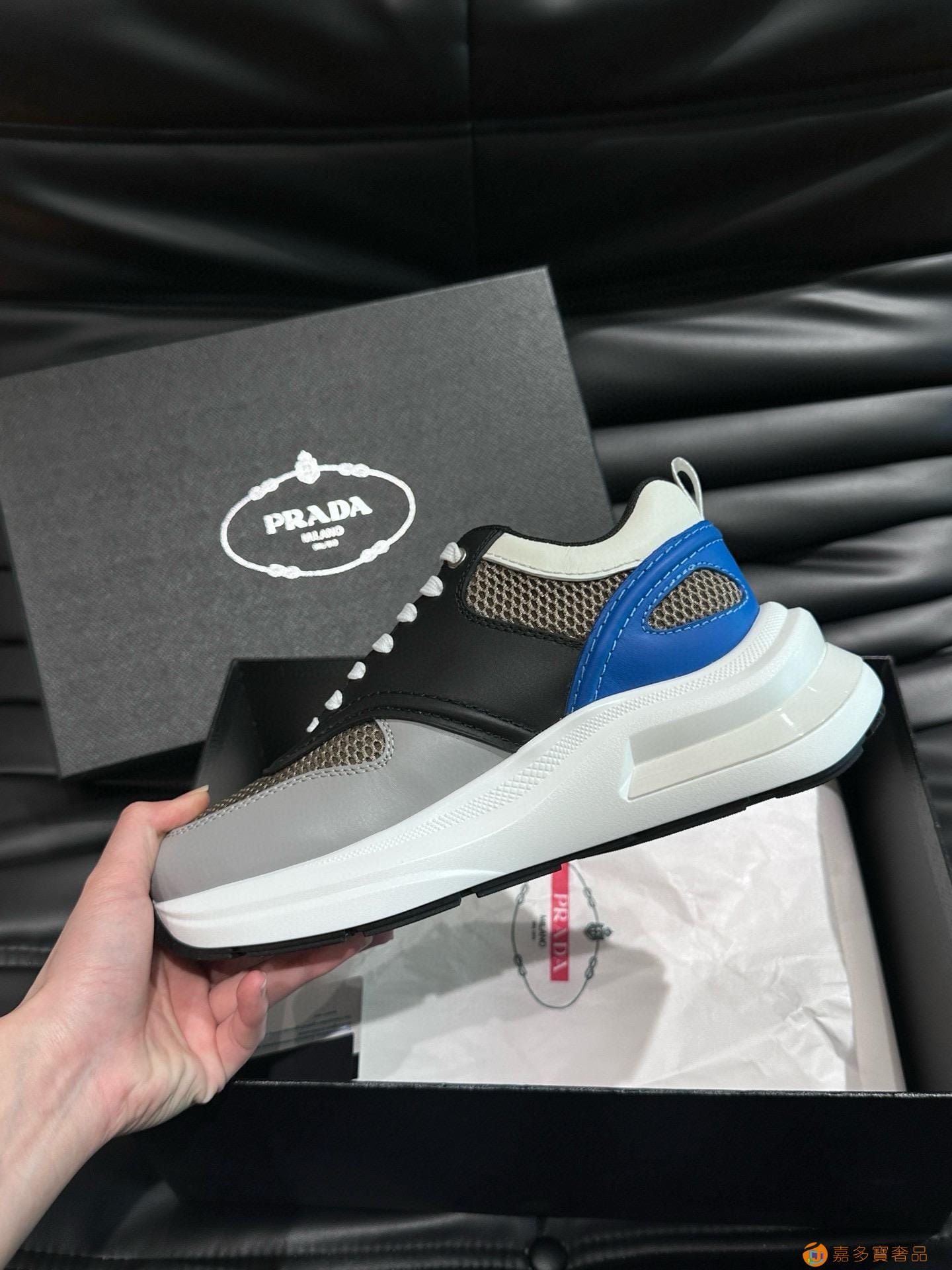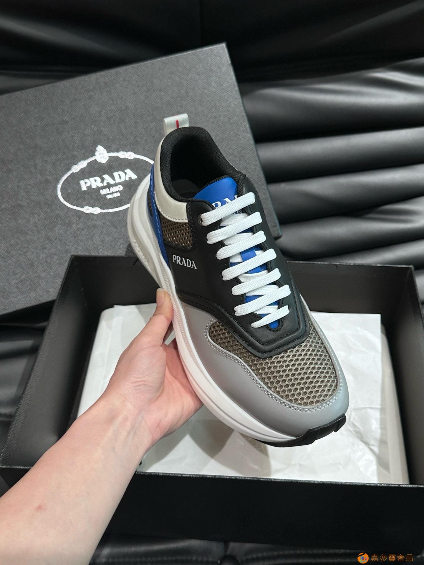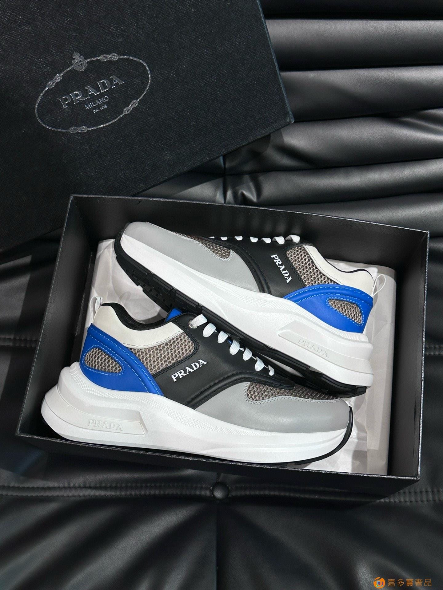 ?:{普拉达}男士皮革休闲运动鞋,莞产猛货!采用进口纯色小牛皮拼接网孔牛皮鞋面,立体几何分割,精工制造,缝线均匀,皮质质感一览无余,多色拼接,时尚大方,柔软舒适透气,外侧饰有RADA字母徽标, 鞋舌饰有经典字母logo,后跟饰有织物提鞋绊,家经典运动鞋型,搭配织物内里,烫银logo牛皮脚垫,搭配家专属橡胶大底,细节精工细作!