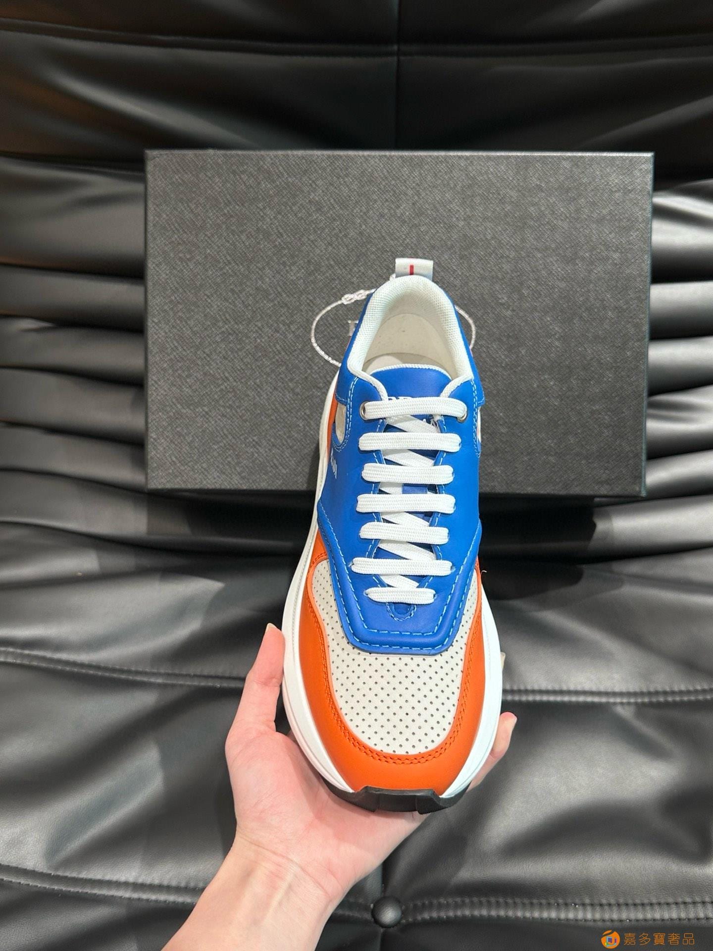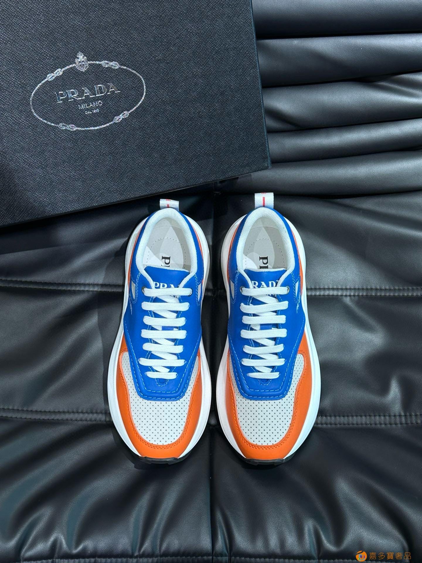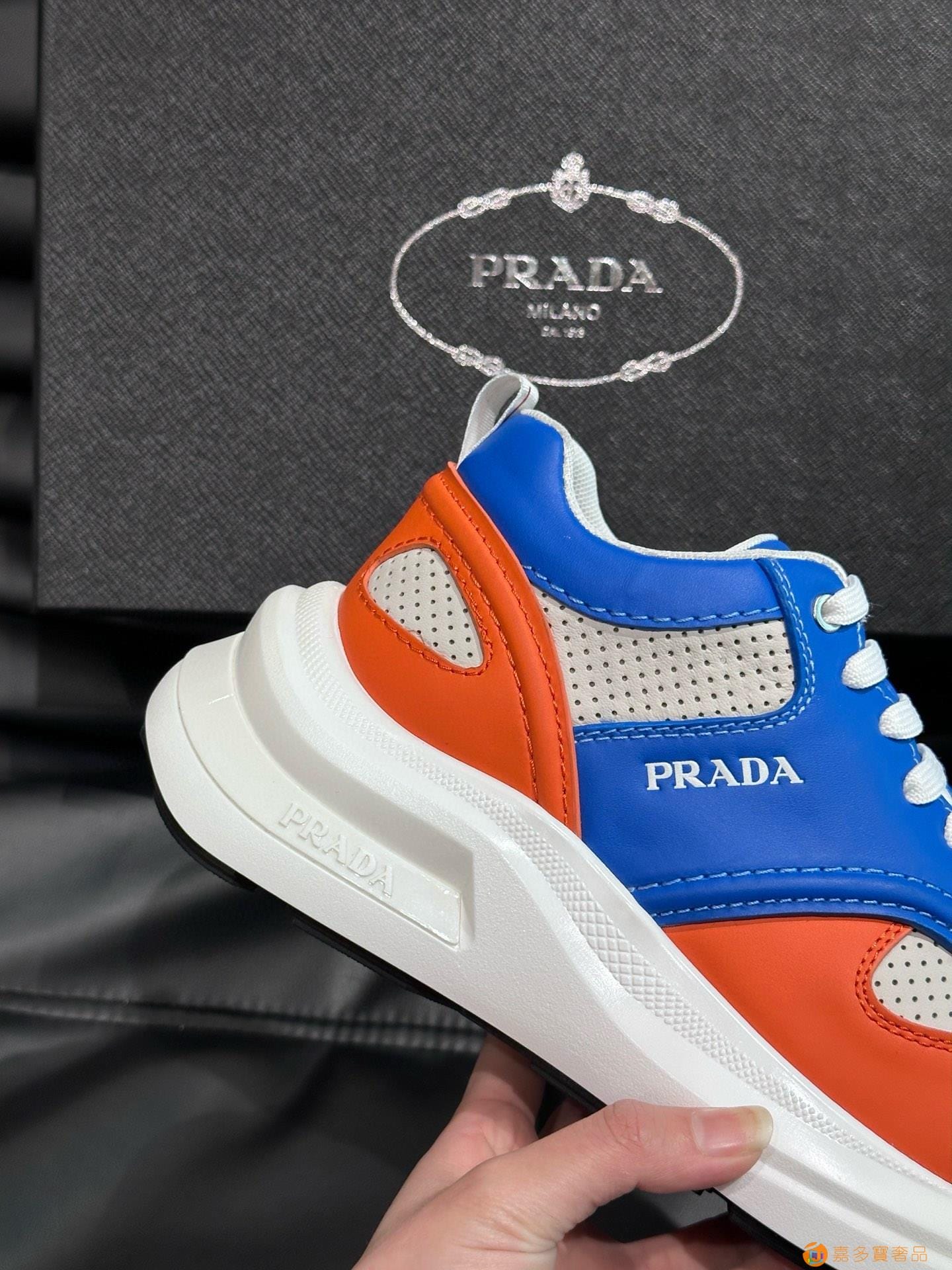 ?:{普拉达}男士皮革休闲运动鞋,莞产猛货!采用进口纯色小牛皮拼接网孔牛皮鞋面,立体几何分割,精工制造,缝线均匀,皮质质感一览无余,多色拼接,时尚大方,柔软舒适透气,外侧饰有RADA字母徽标, 鞋舌饰有经典字母logo,后跟饰有织物提鞋绊,家经典运动鞋型,搭配织物内里,烫银logo牛皮脚垫,搭配家专属橡胶大底,细节精工细作!