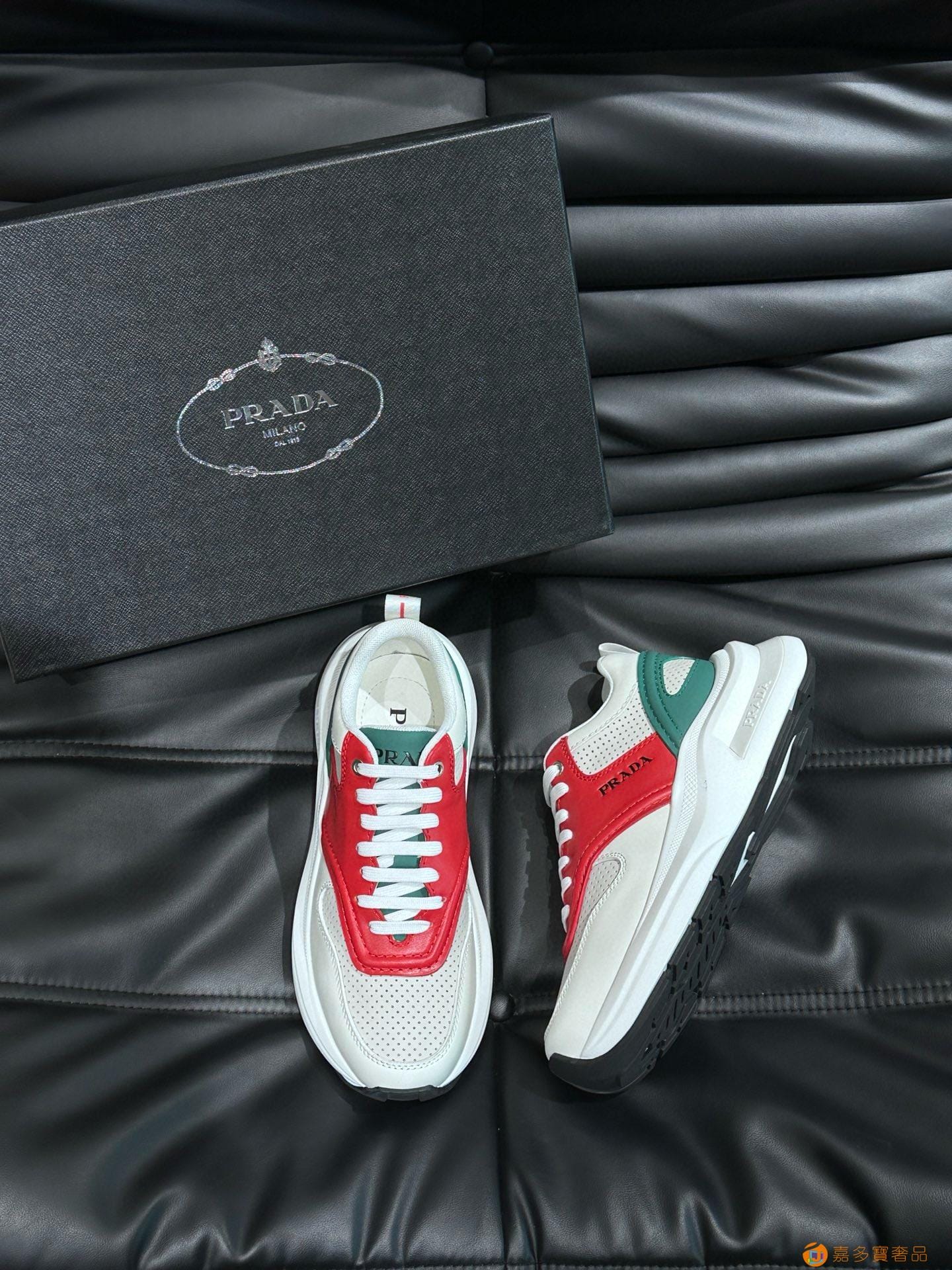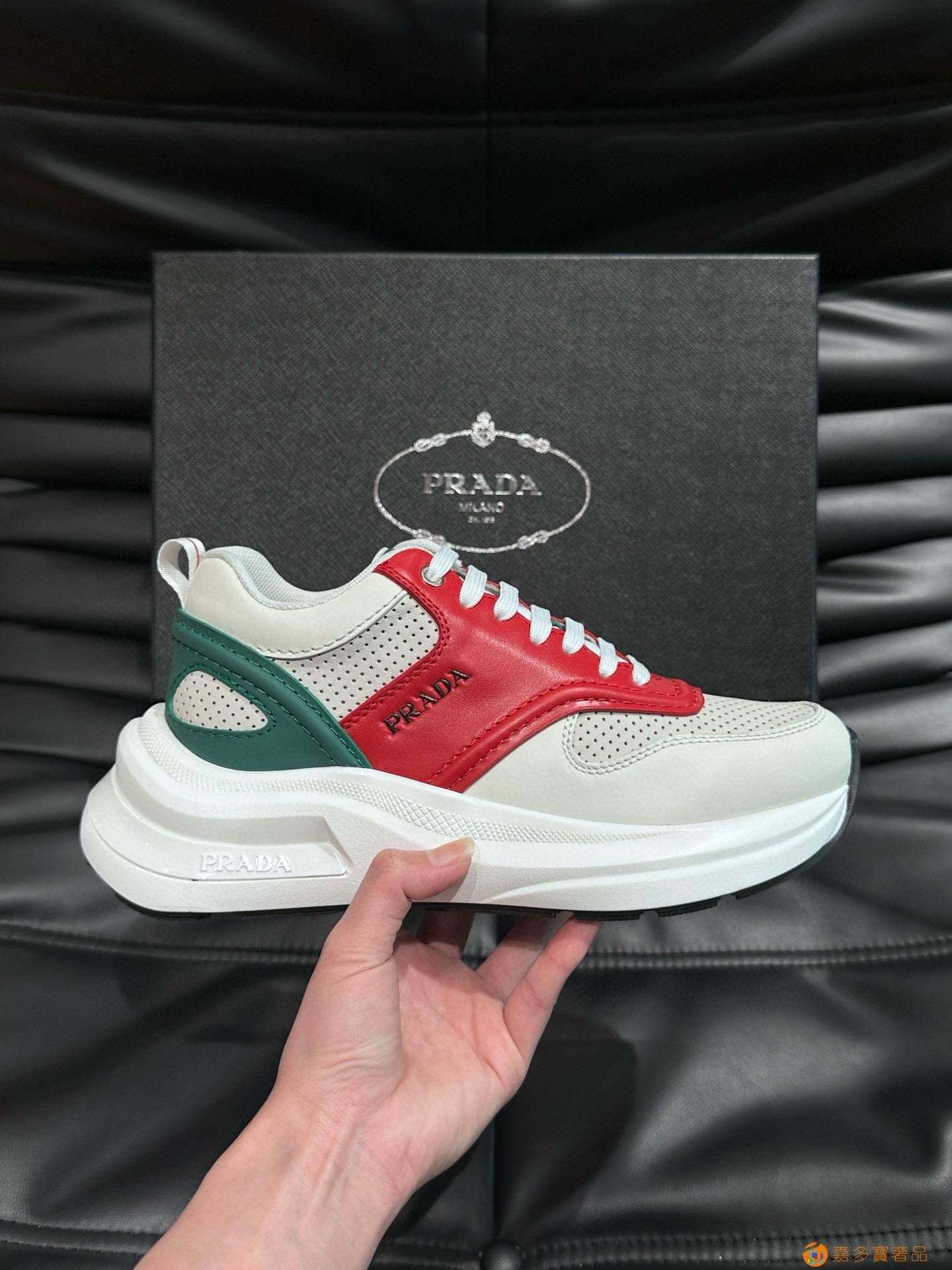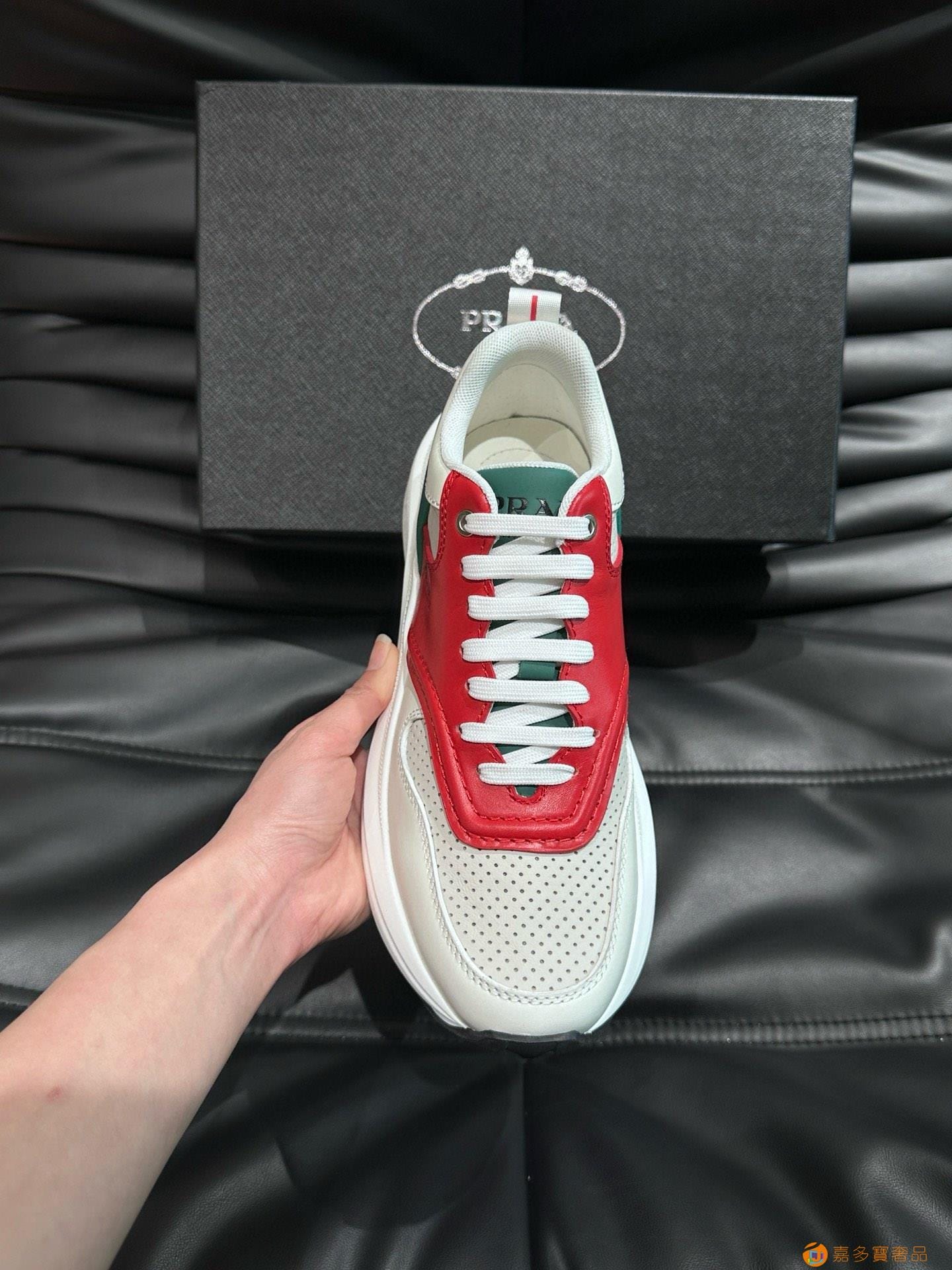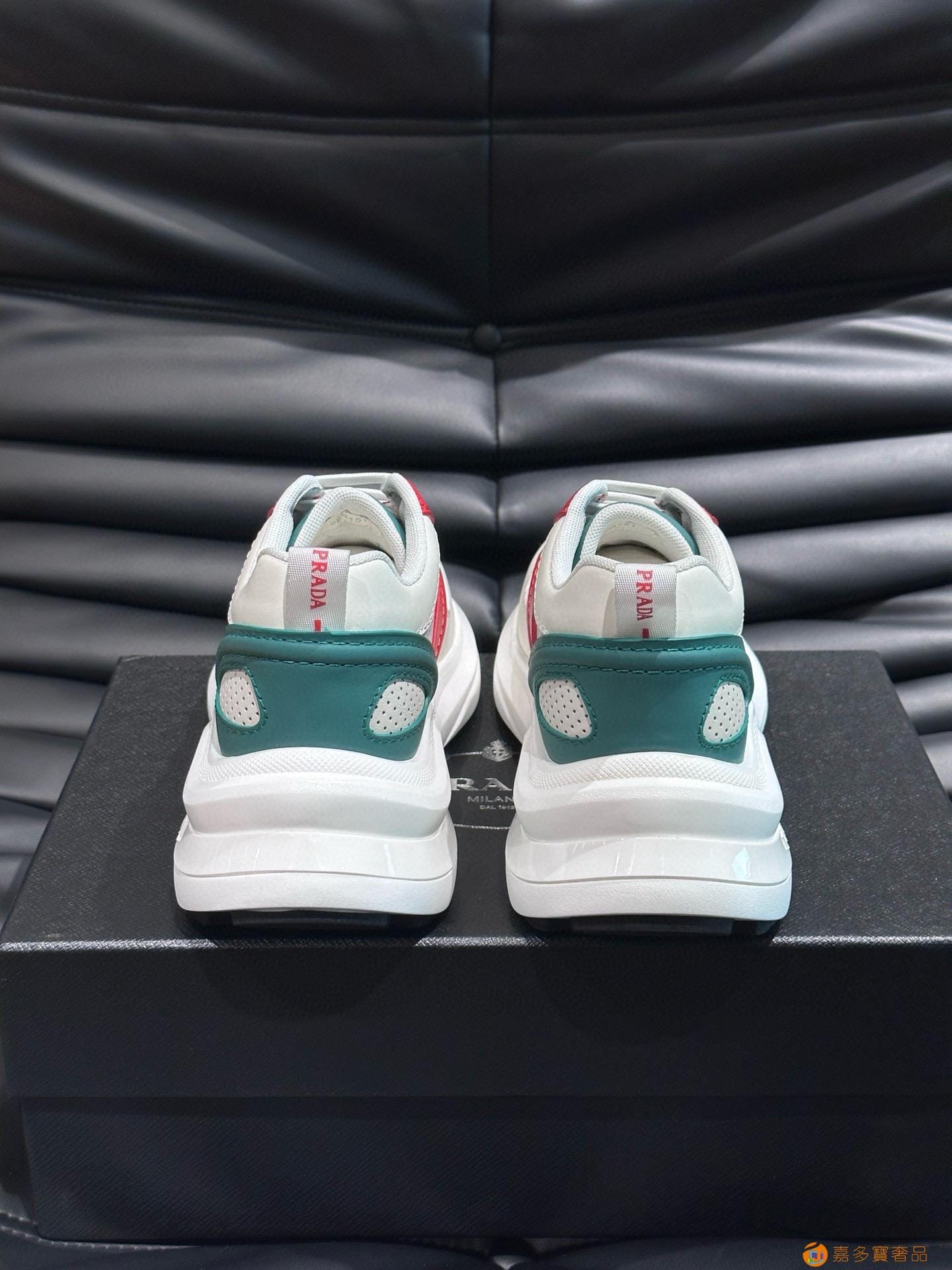 ?:{普拉达}男士皮革休闲运动鞋,莞产猛货!采用进口纯色小牛皮拼接网孔牛皮鞋面,立体几何分割,精工制造,缝线均匀,皮质质感一览无余,多色拼接,时尚大方,柔软舒适透气,外侧饰有RADA字母徽标, 鞋舌饰有经典字母logo,后跟饰有织物提鞋绊,家经典运动鞋型,搭配织物内里,烫银logo牛皮脚垫,搭配家专属橡胶大底,细节精工细作!