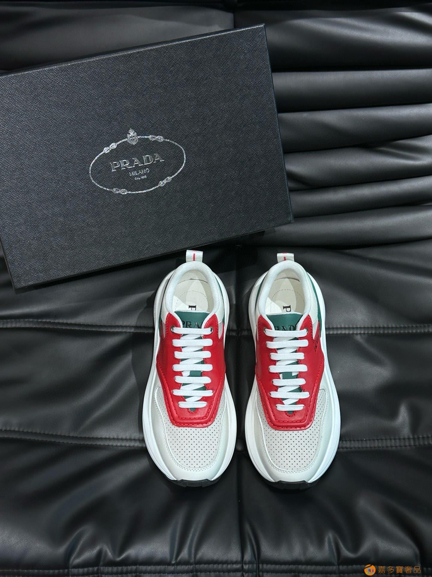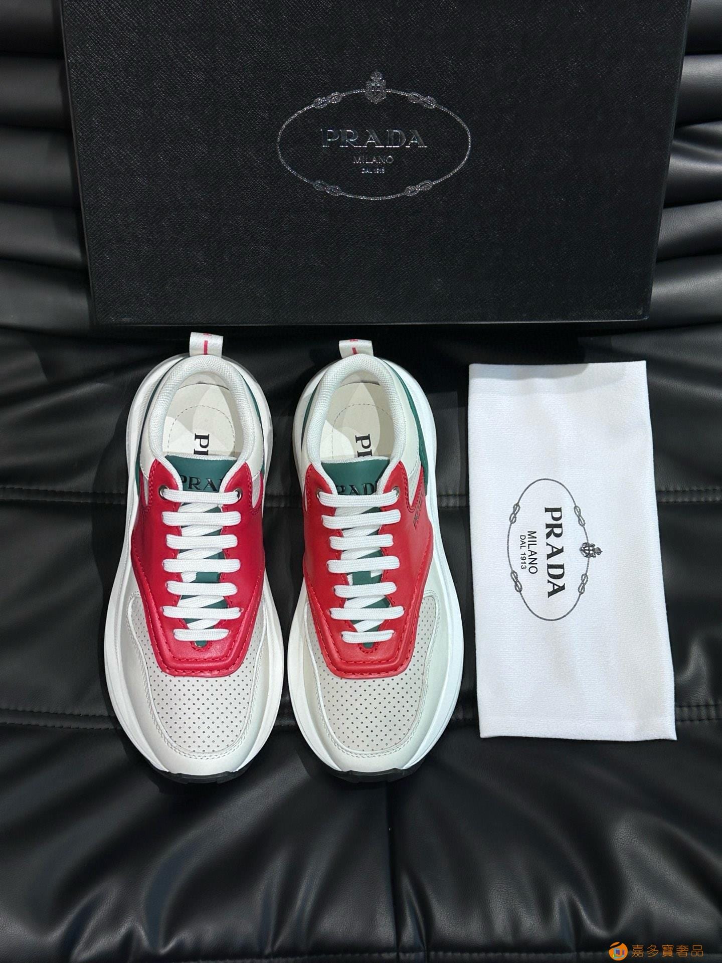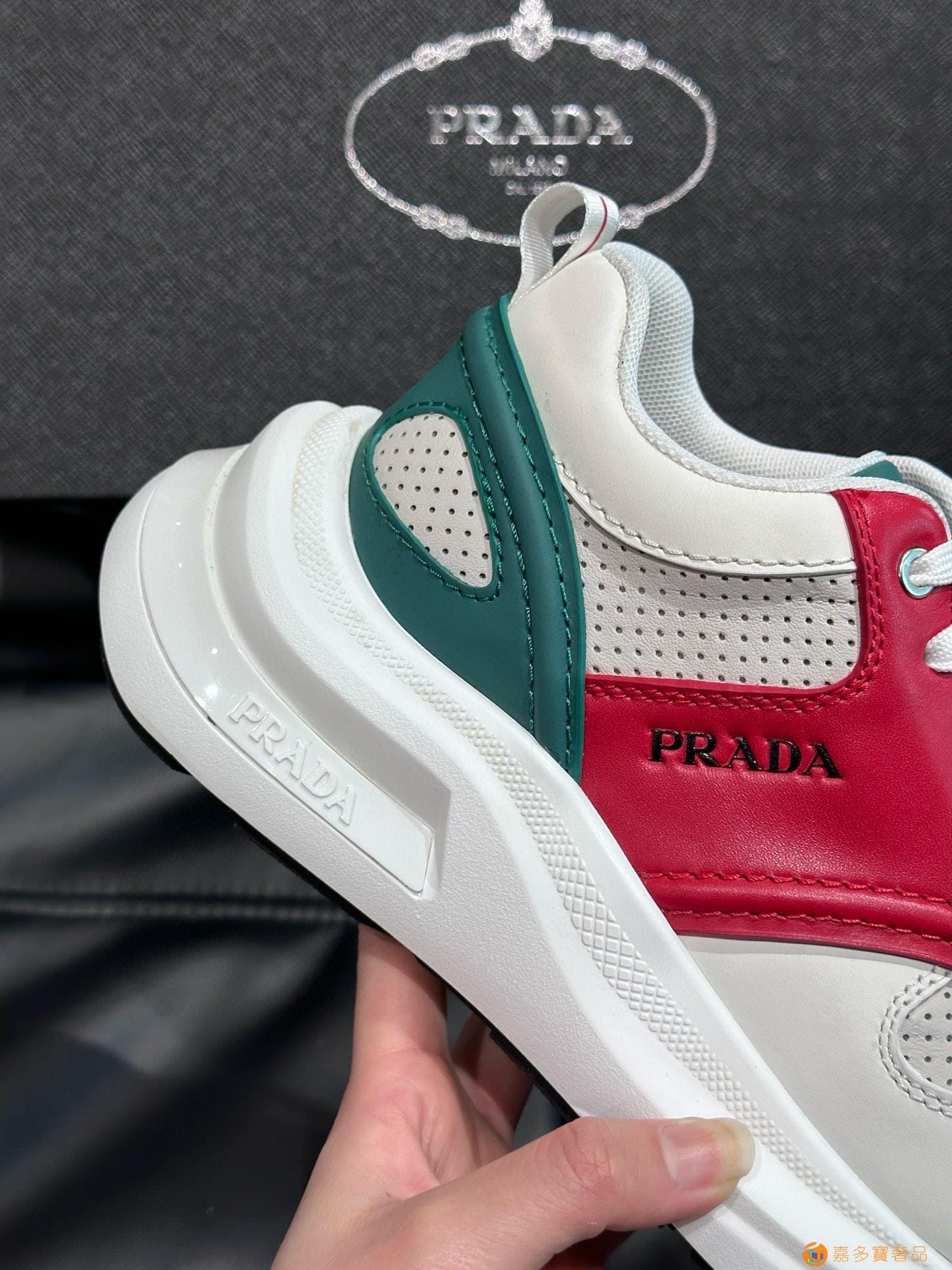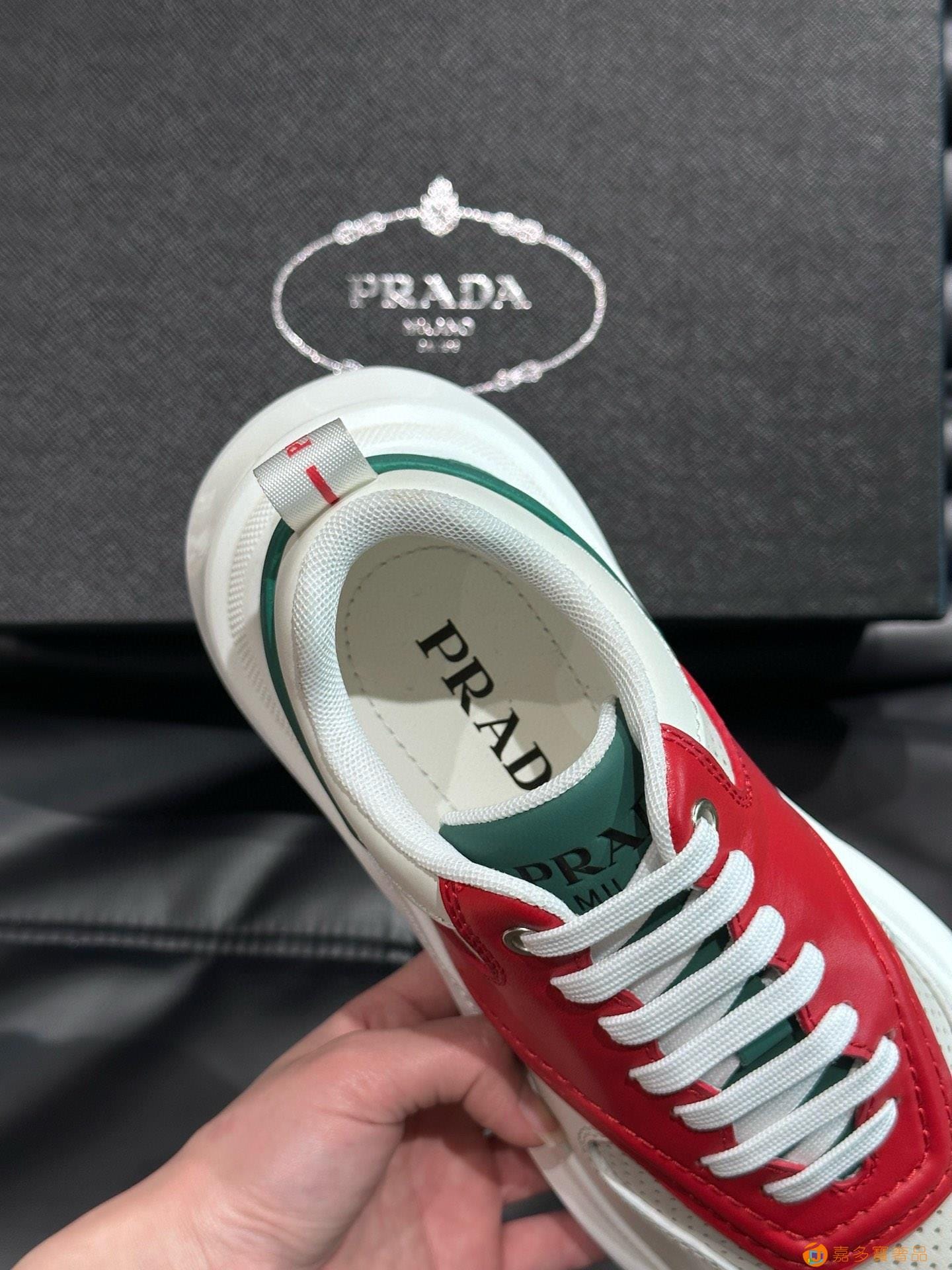 ?:{普拉达}男士皮革休闲运动鞋,莞产猛货!采用进口纯色小牛皮拼接网孔牛皮鞋面,立体几何分割,精工制造,缝线均匀,皮质质感一览无余,多色拼接,时尚大方,柔软舒适透气,外侧饰有RADA字母徽标, 鞋舌饰有经典字母logo,后跟饰有织物提鞋绊,家经典运动鞋型,搭配织物内里,烫银logo牛皮脚垫,搭配家专属橡胶大底,细节精工细作!
