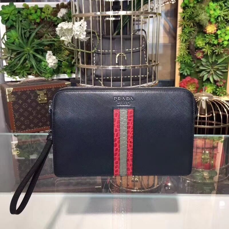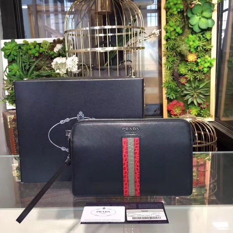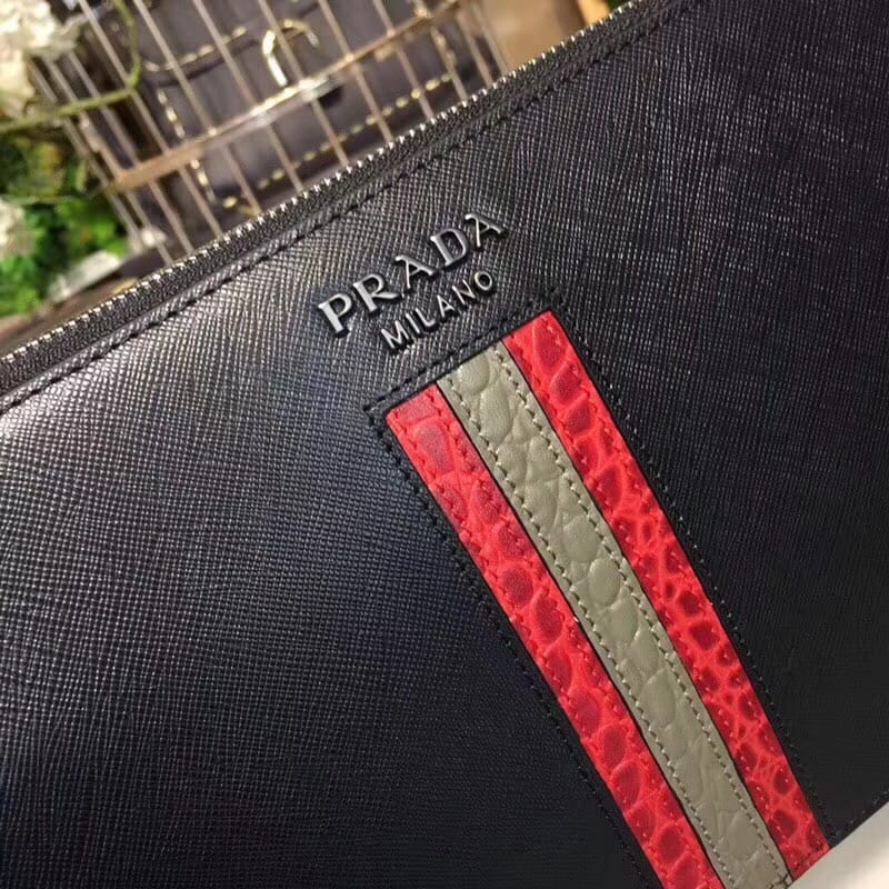 P家2VF056鳄鱼纹拼条红灰红?Saffiano皮革(带对比色嵌花装饰)抛光钢质配件内部标签铭牌,外部金属徽标一个拉链隔层两个内袋六个银行卡槽带皮质饰边的Prada标识衬里背面扁平手柄可拆卸皮质腕带?专柜同步???尺寸 :26.5×17×5cm欢迎订购
